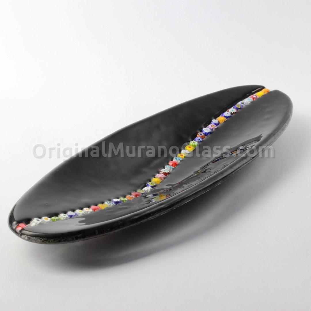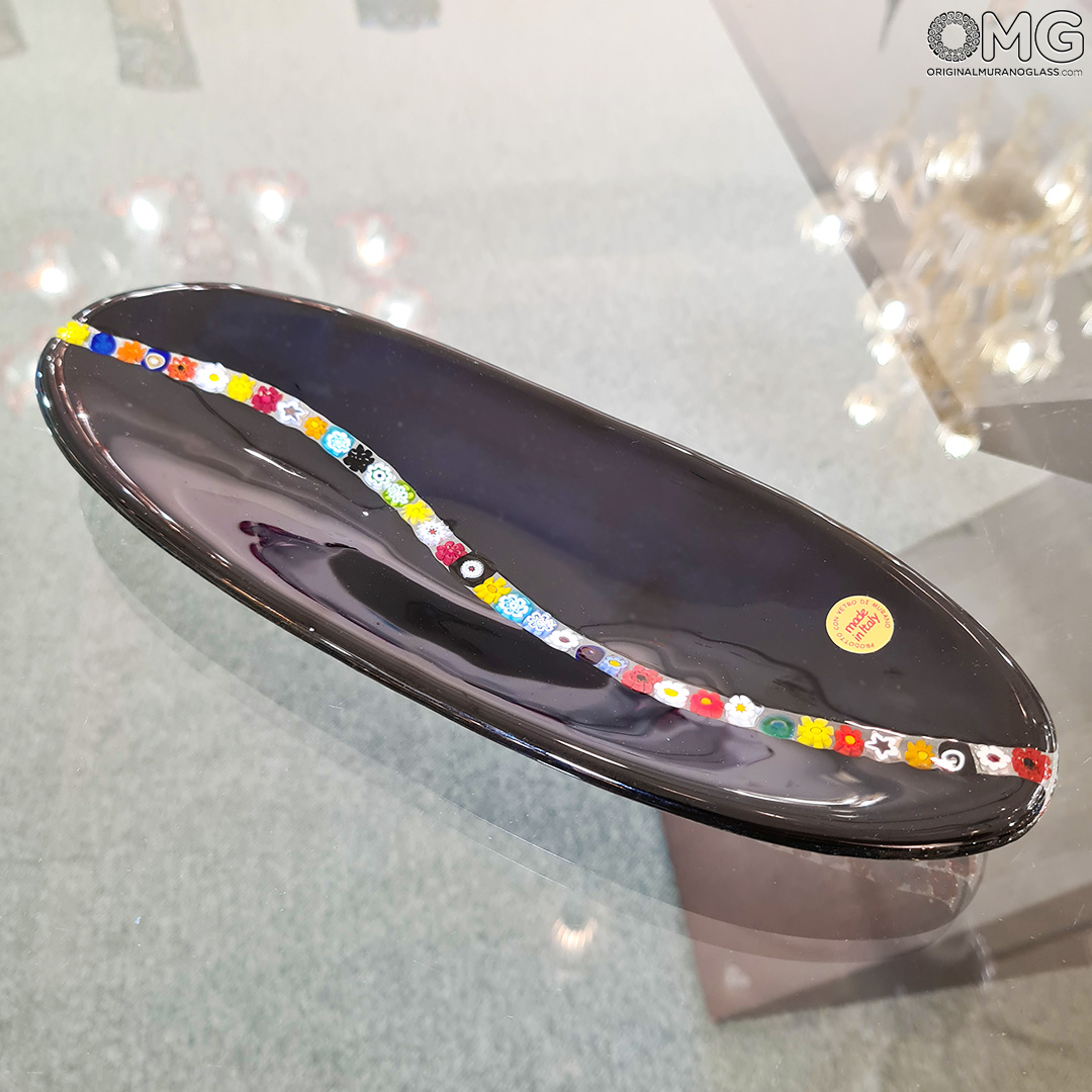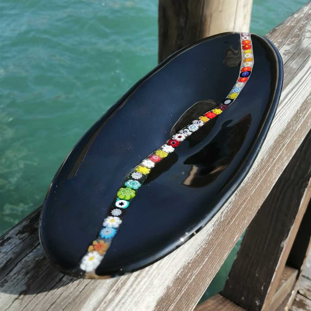 Bandeja vacía exclusiva con decoración Murrina Millefiori sobre cristal negro. Hecha a mano mediante la técnica de fusión del vidrio. Se puede utilizar como bandeja vacía o como plato para dulces. Perfecta también para decorar una mesa de gala o para crear juegos cromáticos.