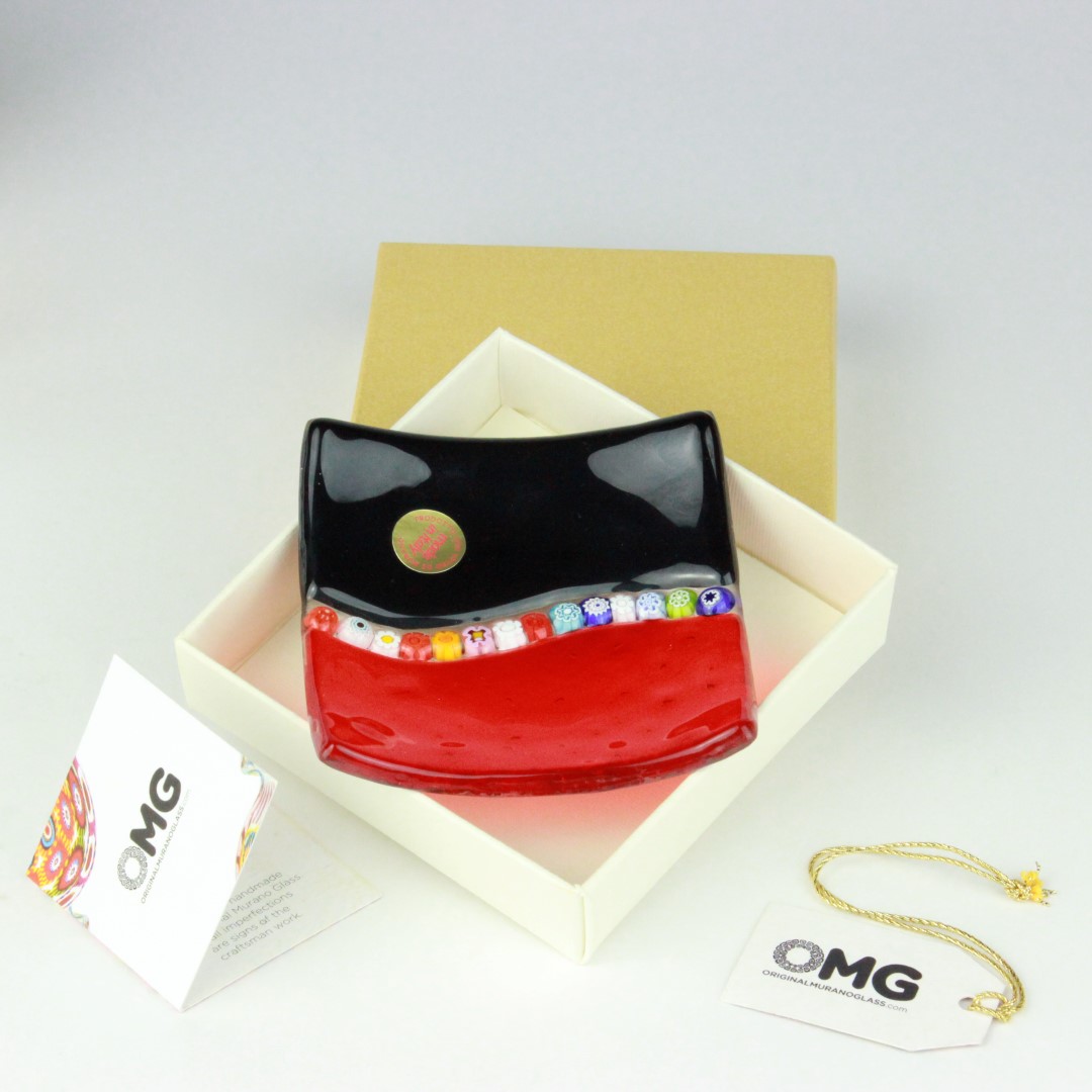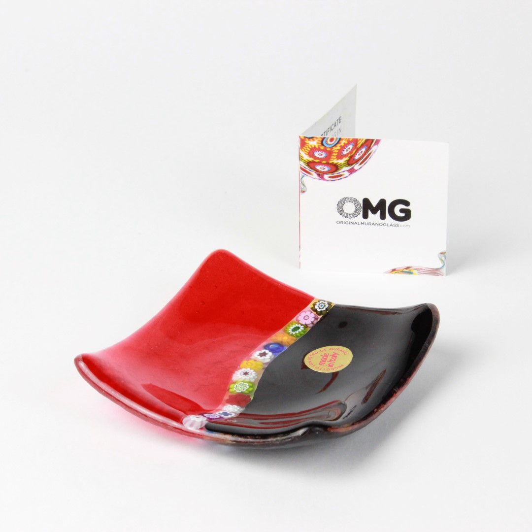 Plato original de cristal de Murano con diseño «empty pocket» y decoración Millefiori, en cristal rojo y negro. Realizado mediante la técnica de fusión de cristal. Para pedidos de grandes cantidades, póngase en contacto con nosotros.