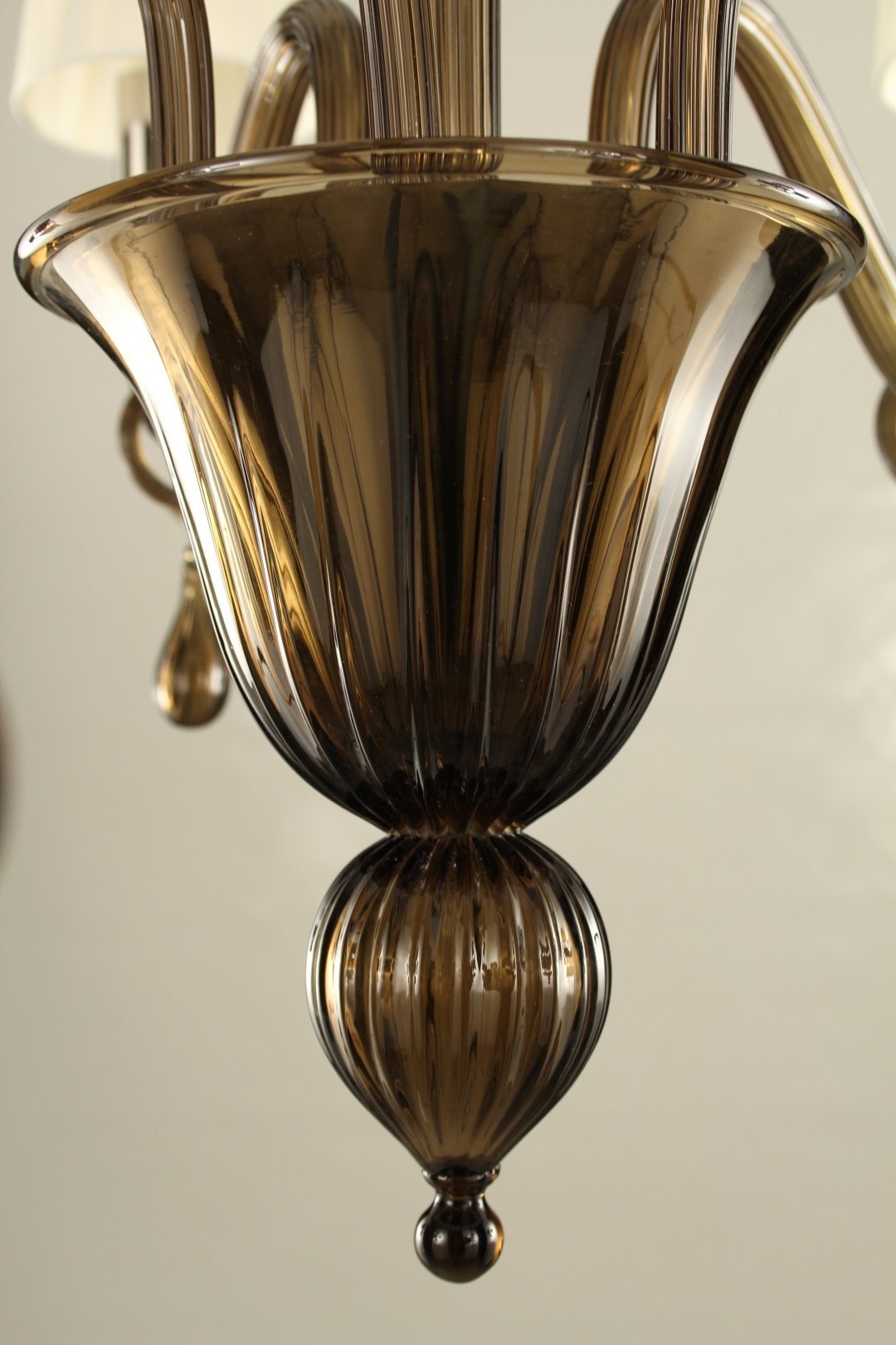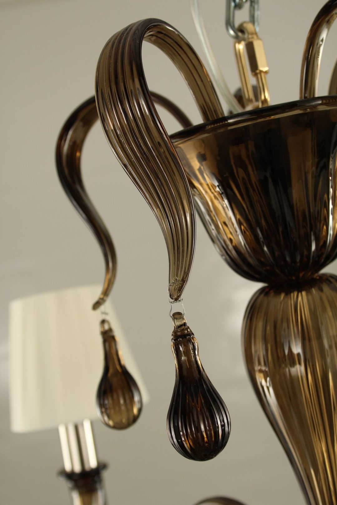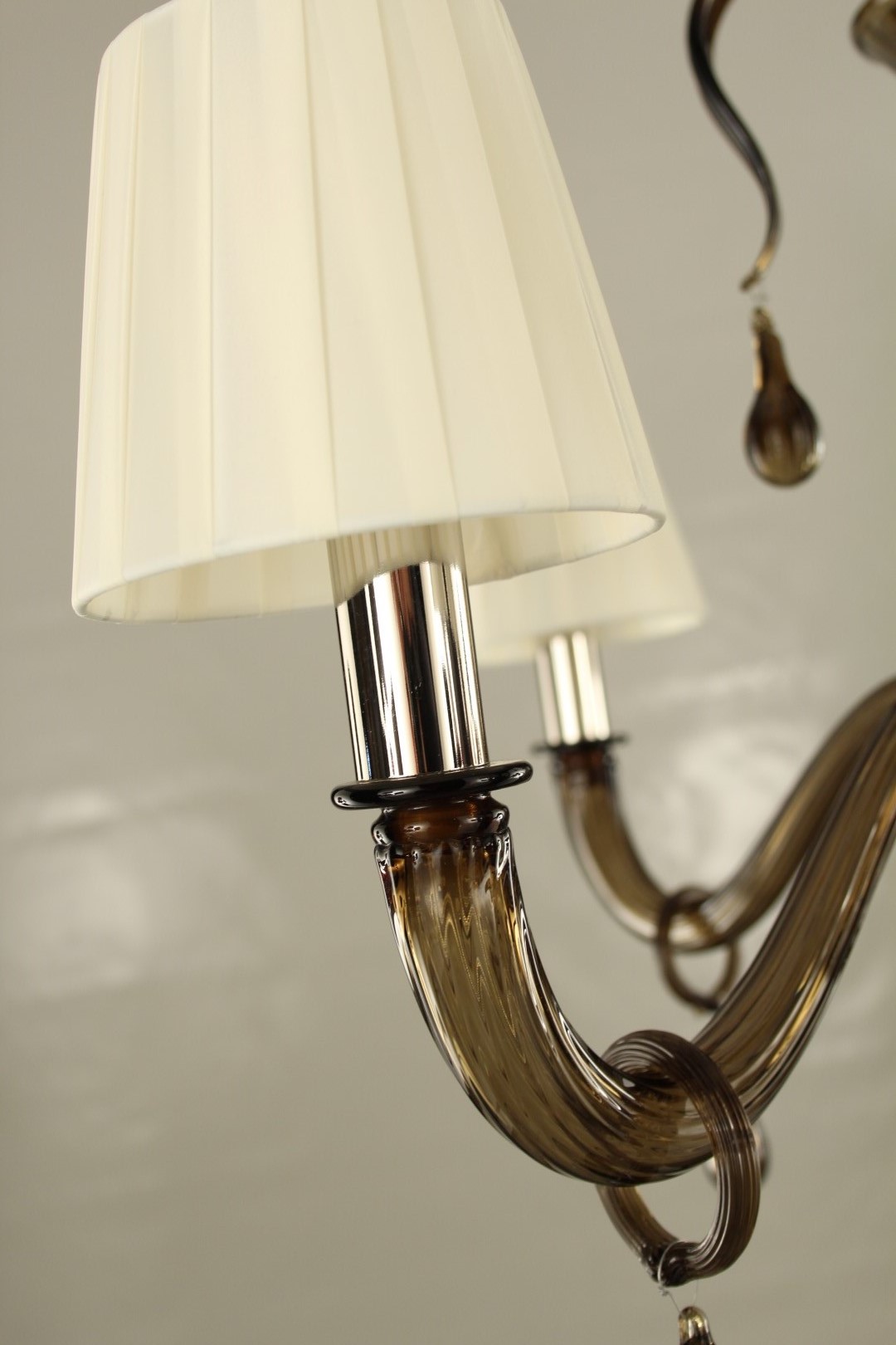 Luxury Chandelier in fumè glass color with pendants and with lampshades.
