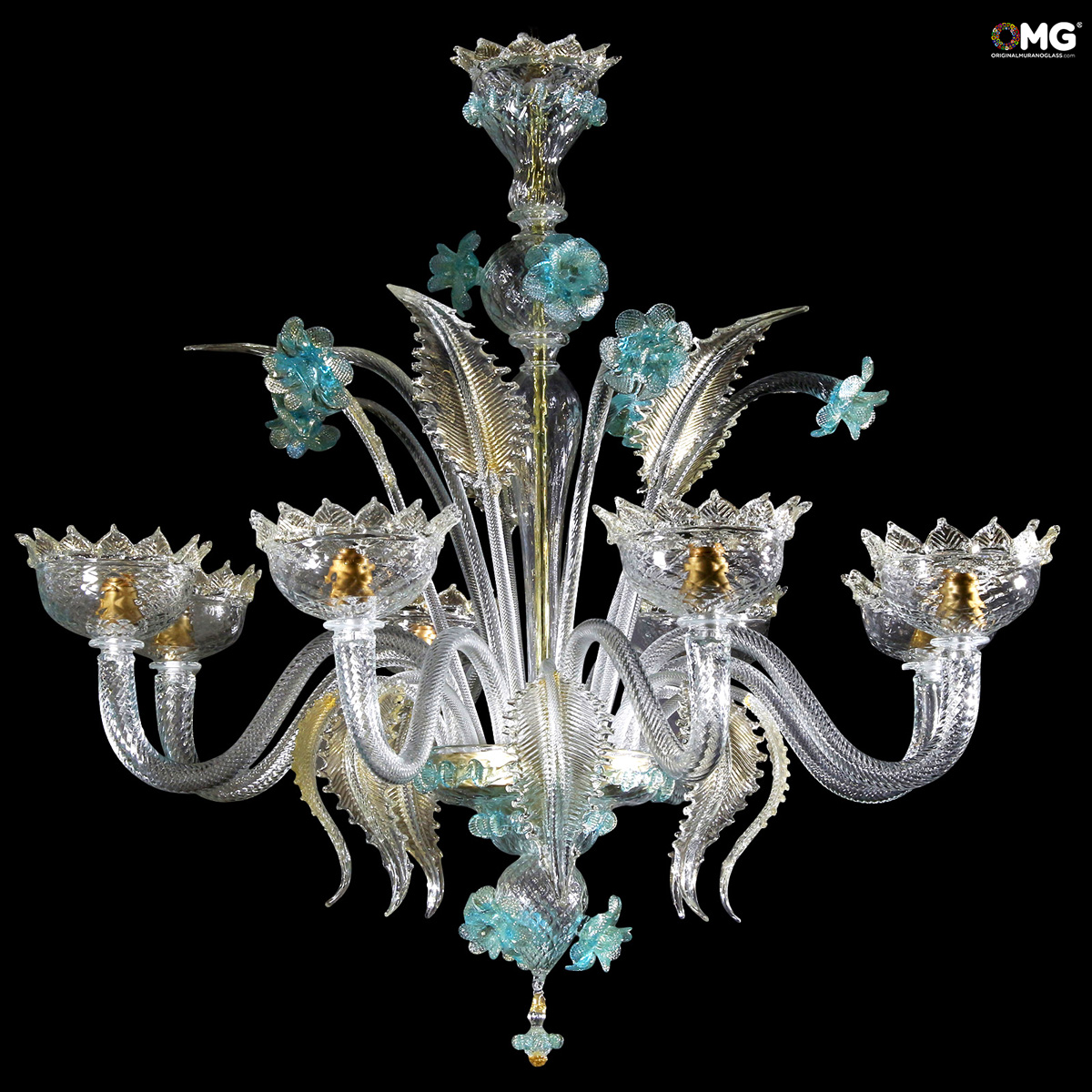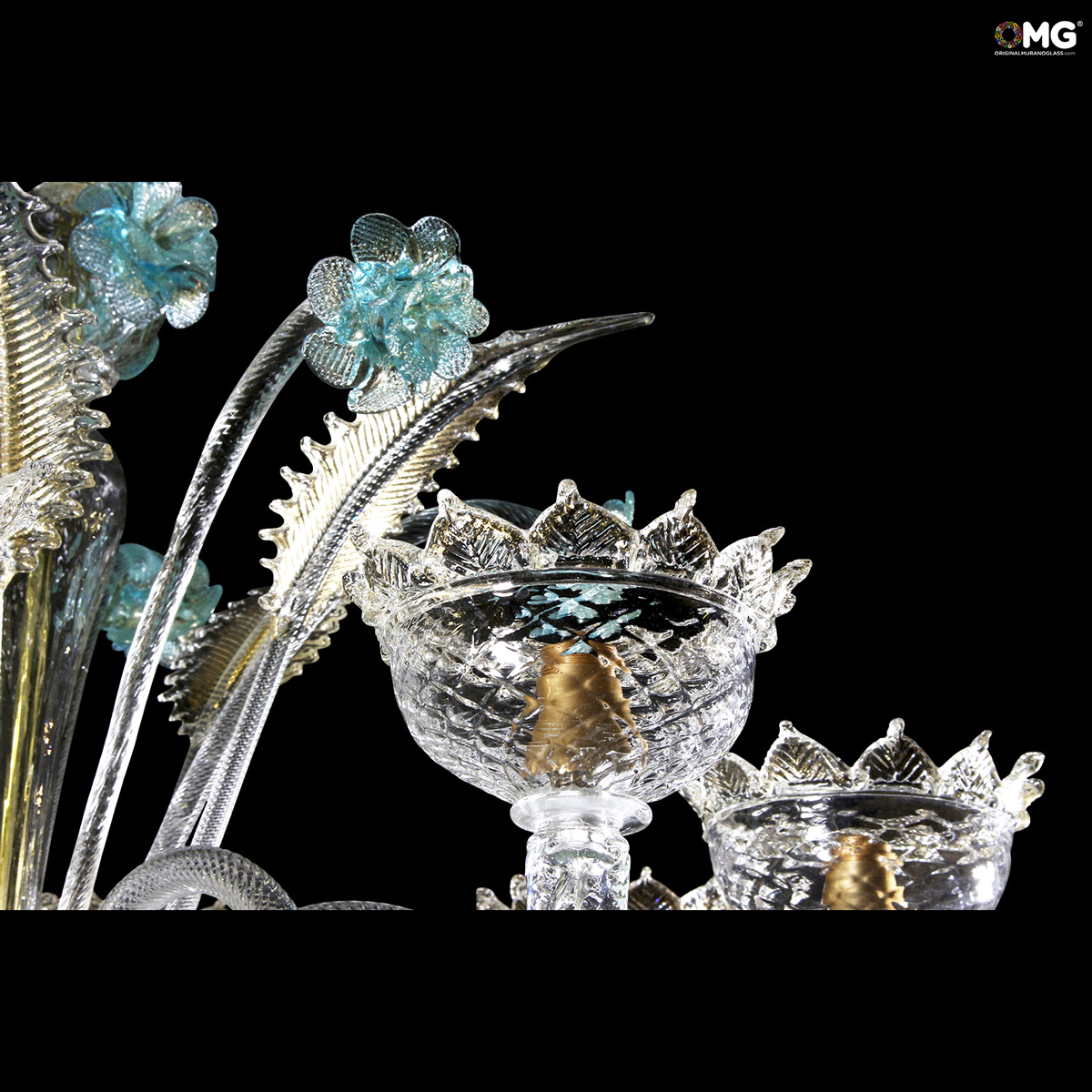 Venetian classique Chandelier in blown color crystal, with pure 24kt gold and light blue details flowers.
