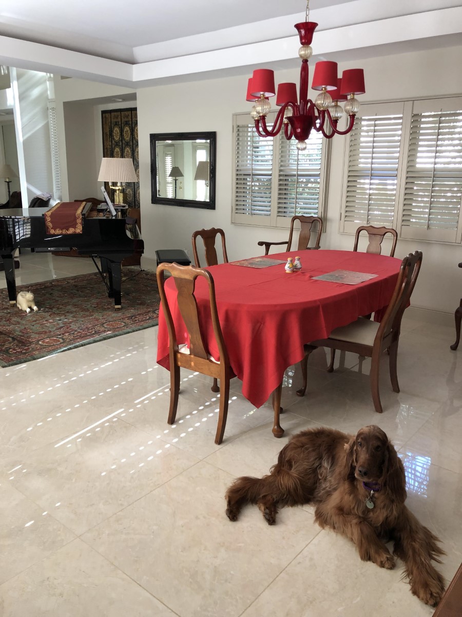 Venetian Chandelier, art glass red color with gold 24 kt balls and details. Lampshades in red organza.