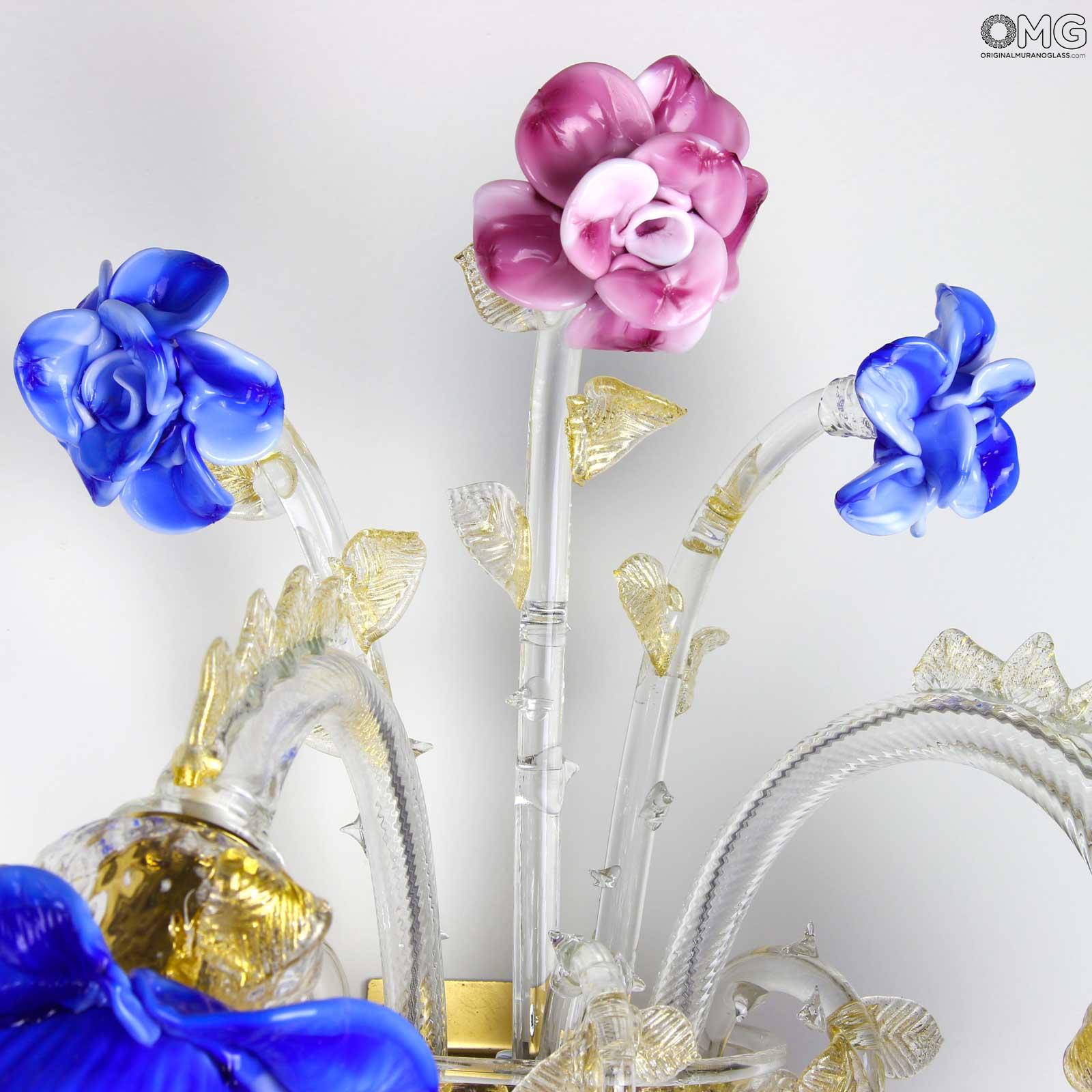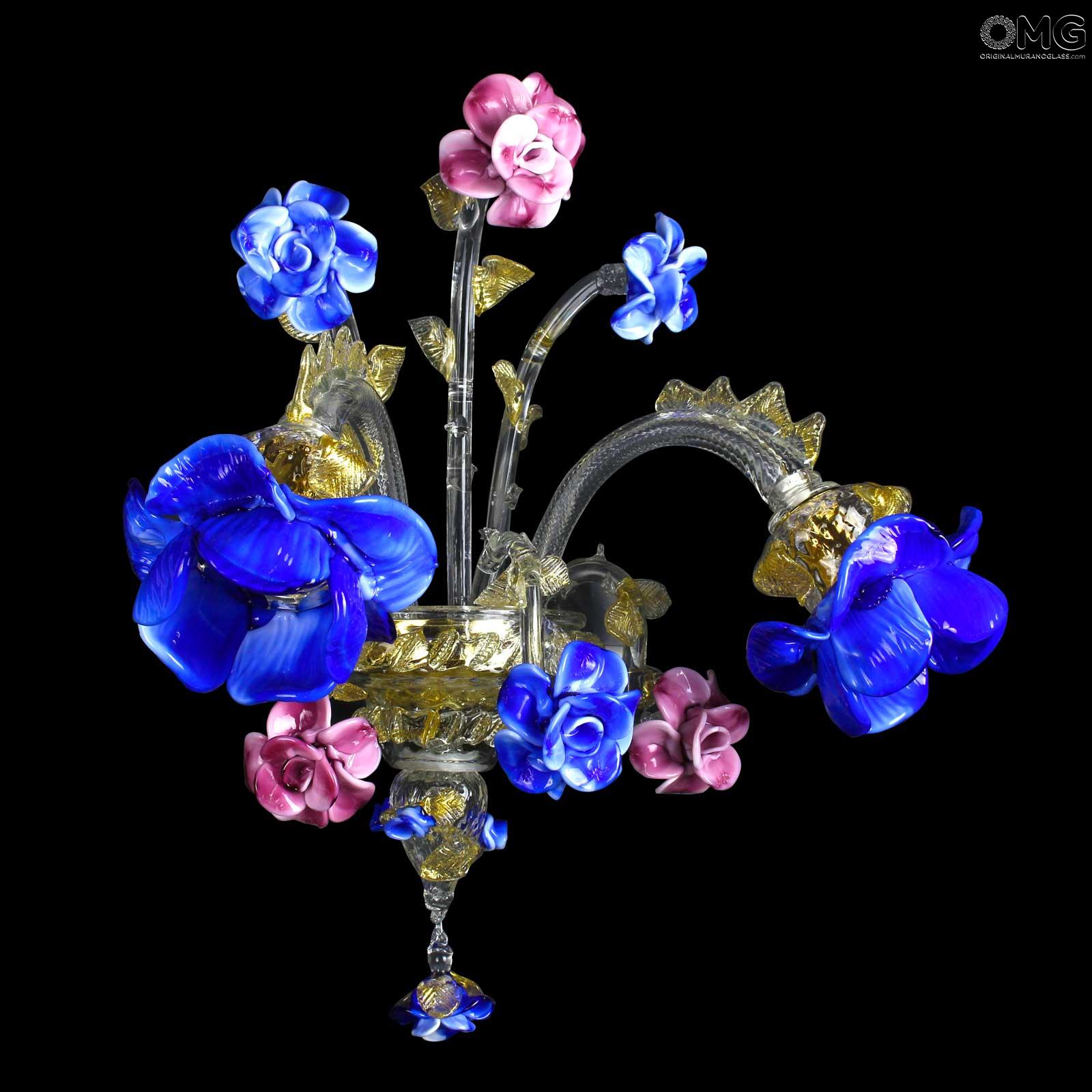 Applique available with 1 or 2 lights in blown crystal glass and colored flowers in matt blue and pink glass