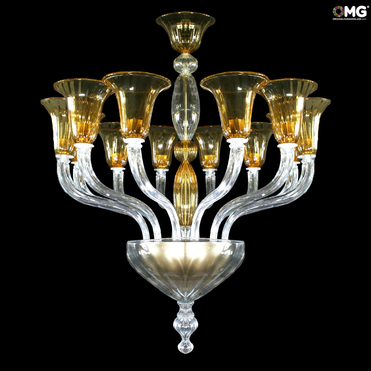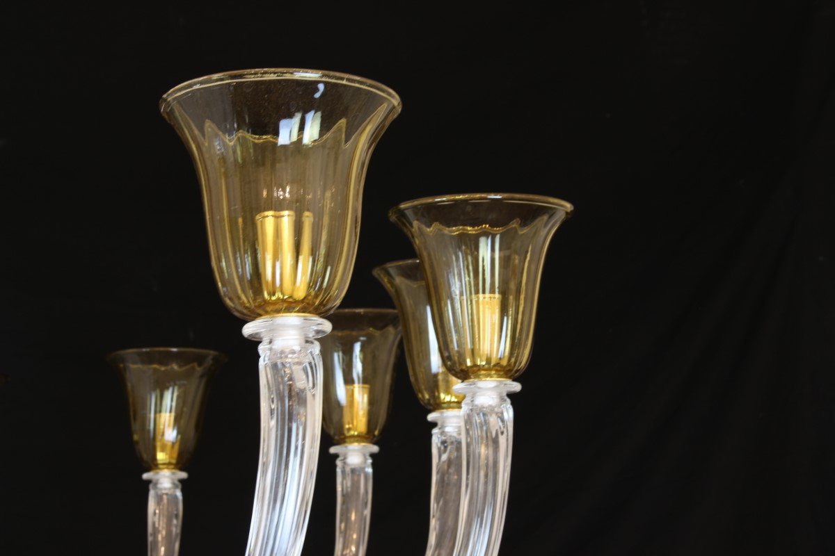 Exclusive venetian chandelier with clear glass crystall and amber glass color.
