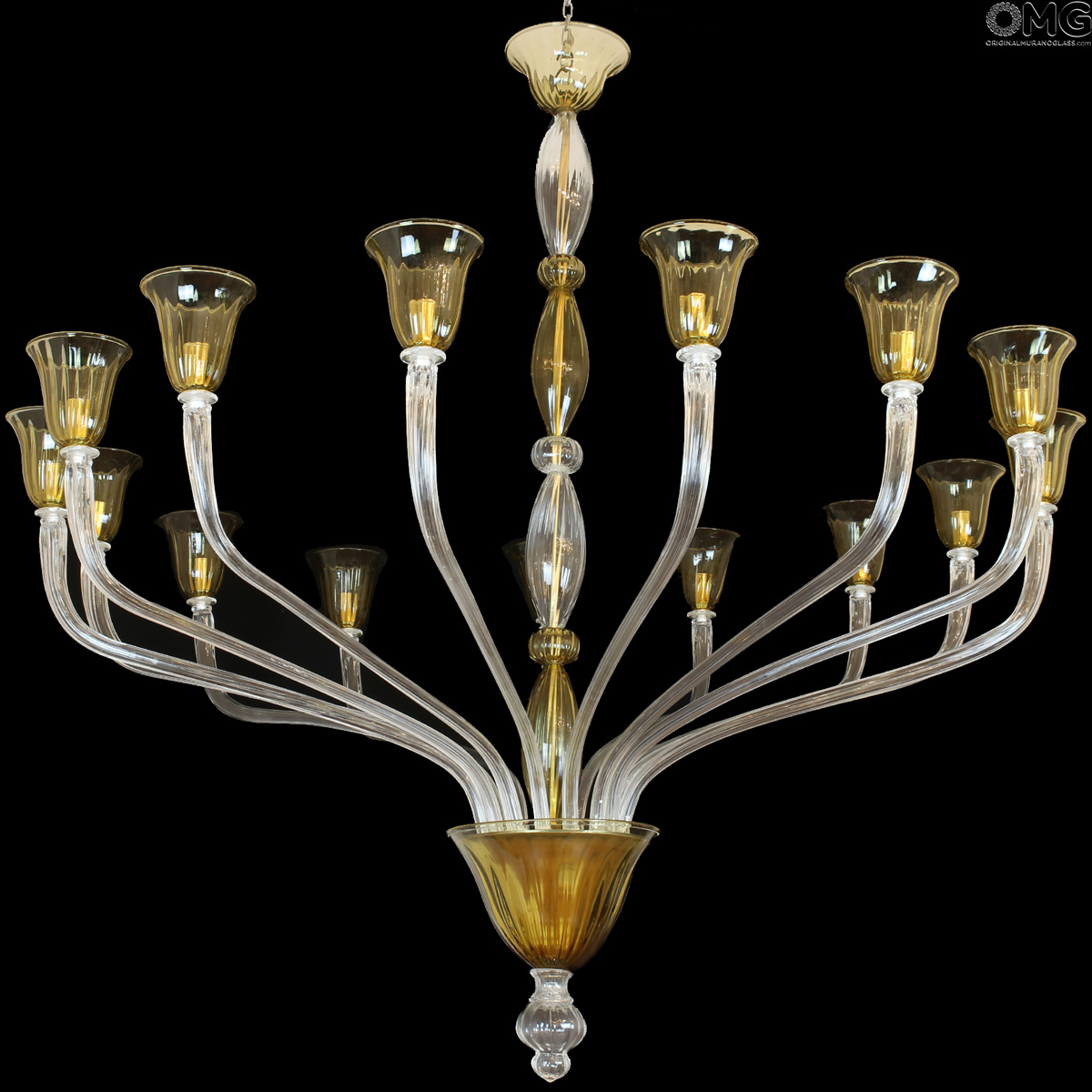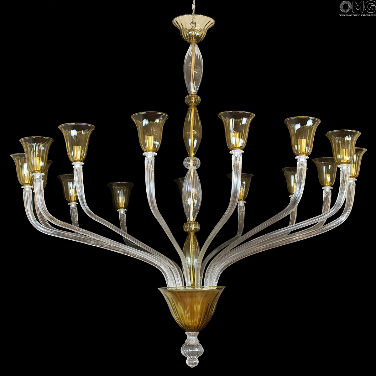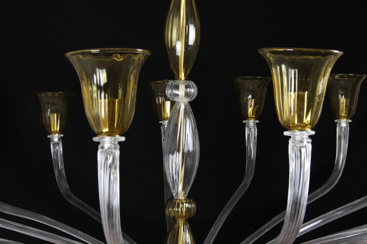Exclusive venetian chandelier with clear glass crystall and amber glass color.
