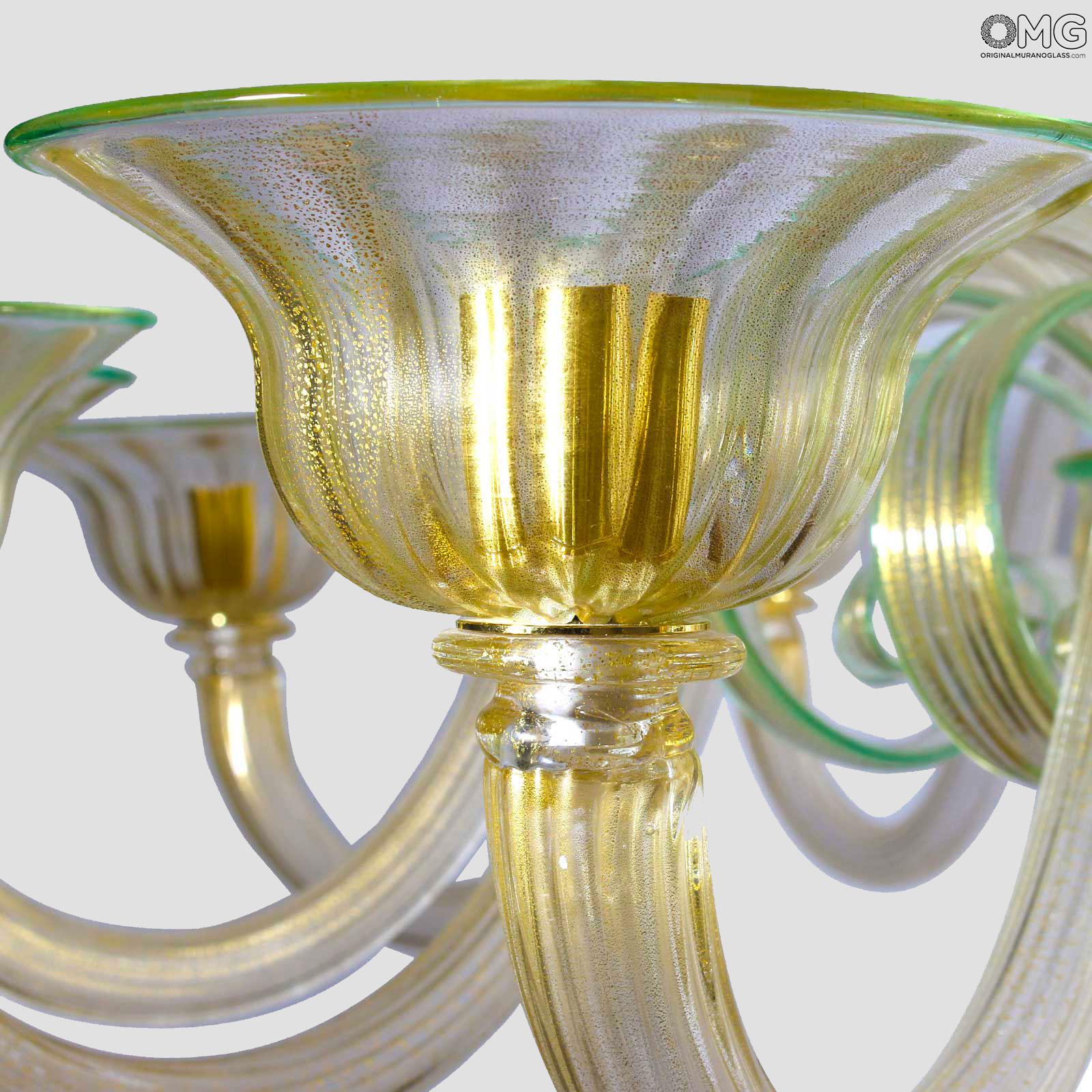 Venetian Chandelier in pure gold 24kt with green glass details.