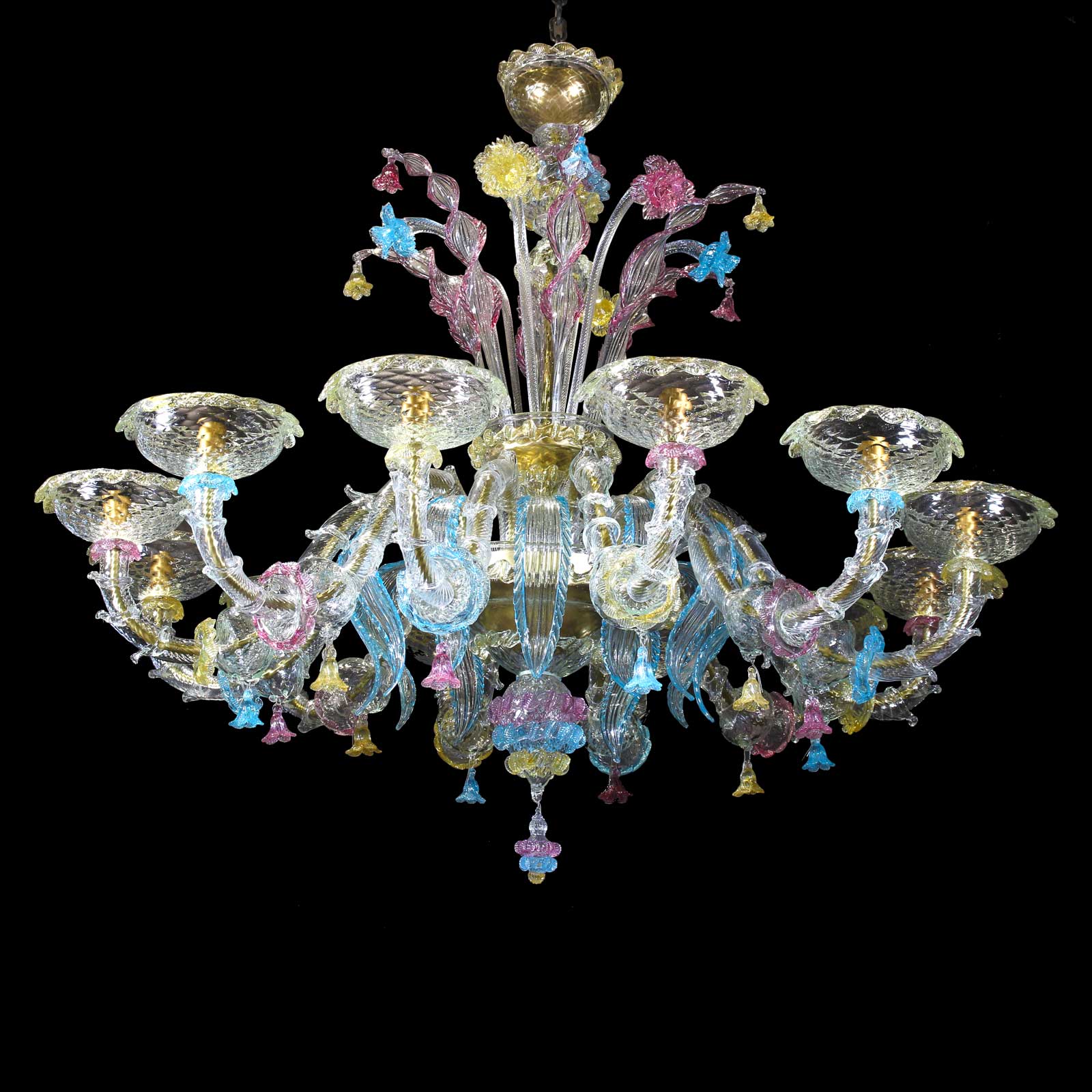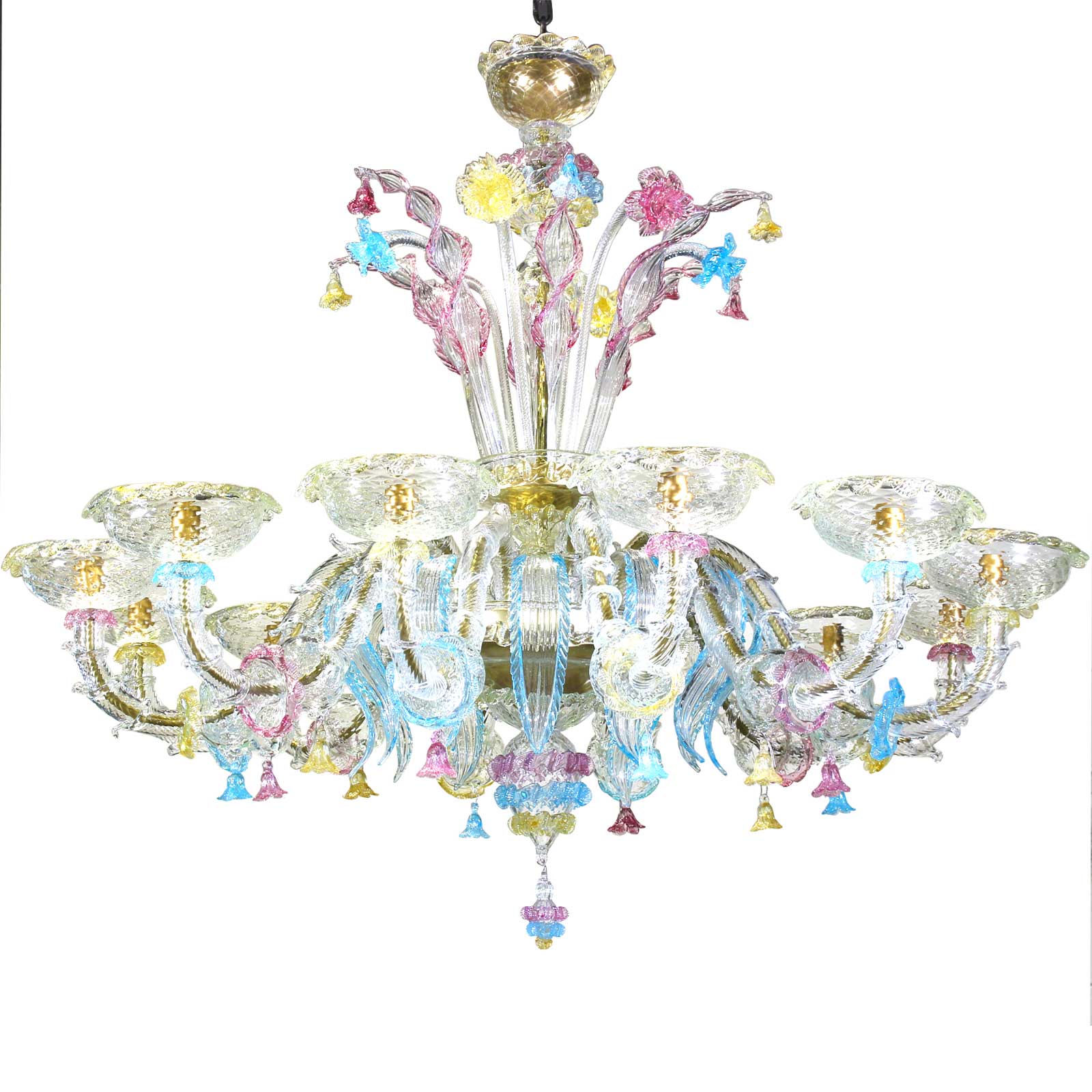 Chandelier handmade according with the old Murano glass tradition, handcrafted in blown glass.