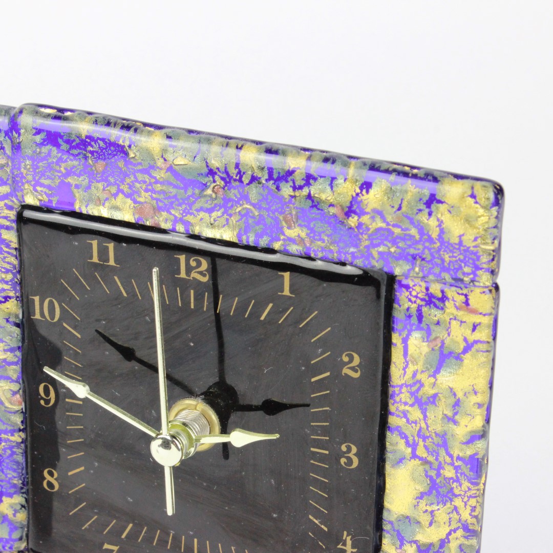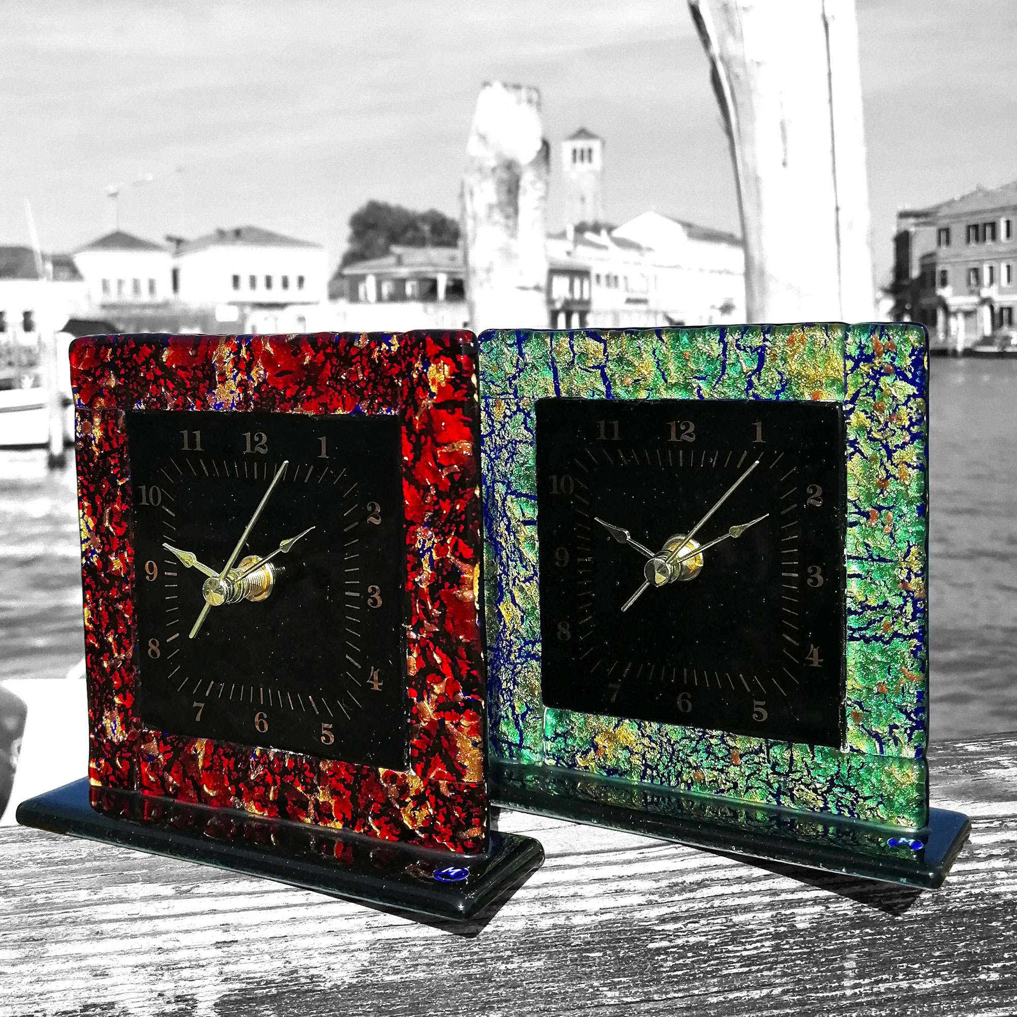 This green blue Murano glass table clock is handmade with the technique of glass fusing, enriched with pure 24 kt gold. Crafted in Murano, Venice, by skilled glass artisans, the piece features vivacious green blue tones and clean lines, making it a sophisticated décor for any desk, reception area, office or living room.