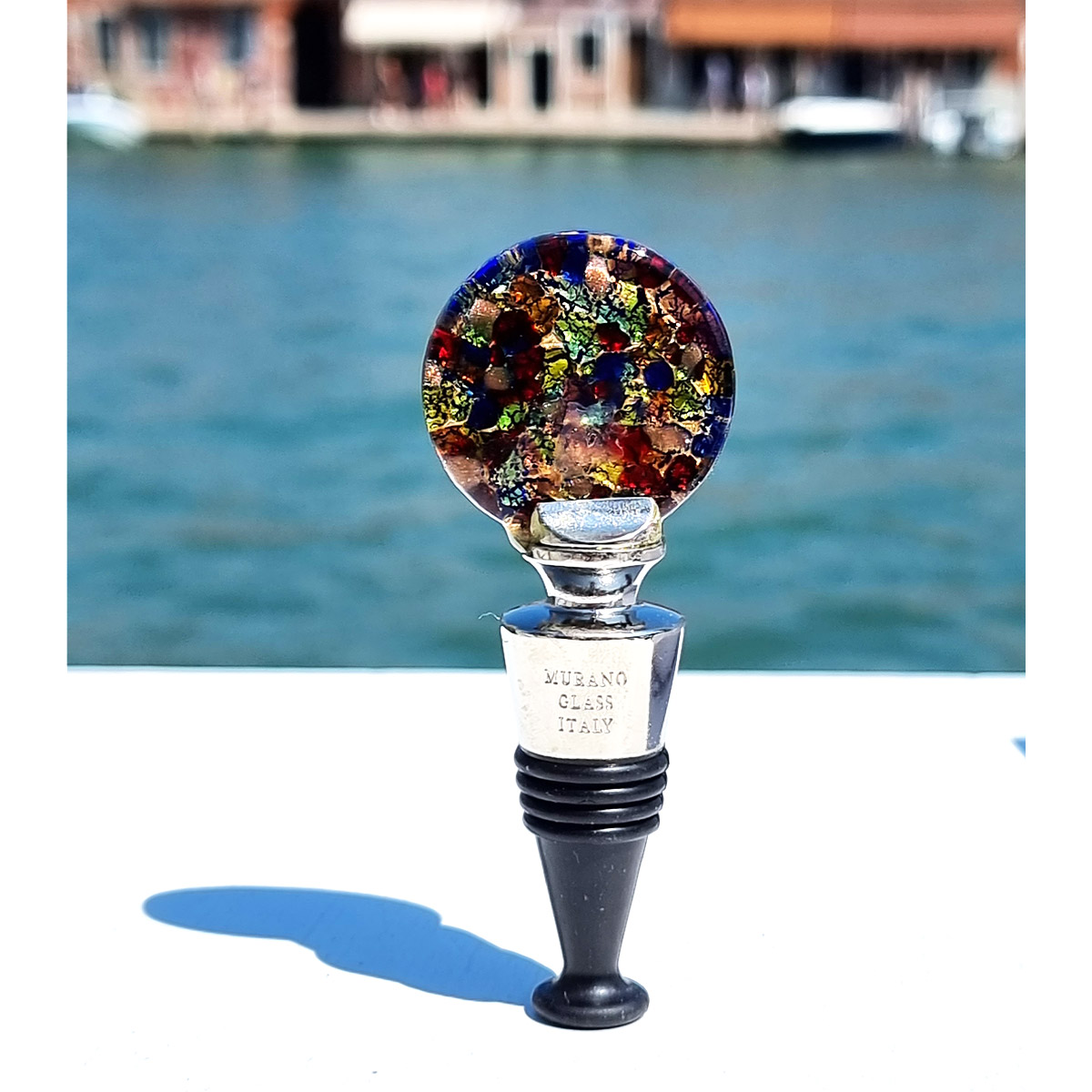 Tapón para botella hecho a mano con la técnica de fusión del vidrio en vidrio de Murano original, con colores azules, milflores y plata.