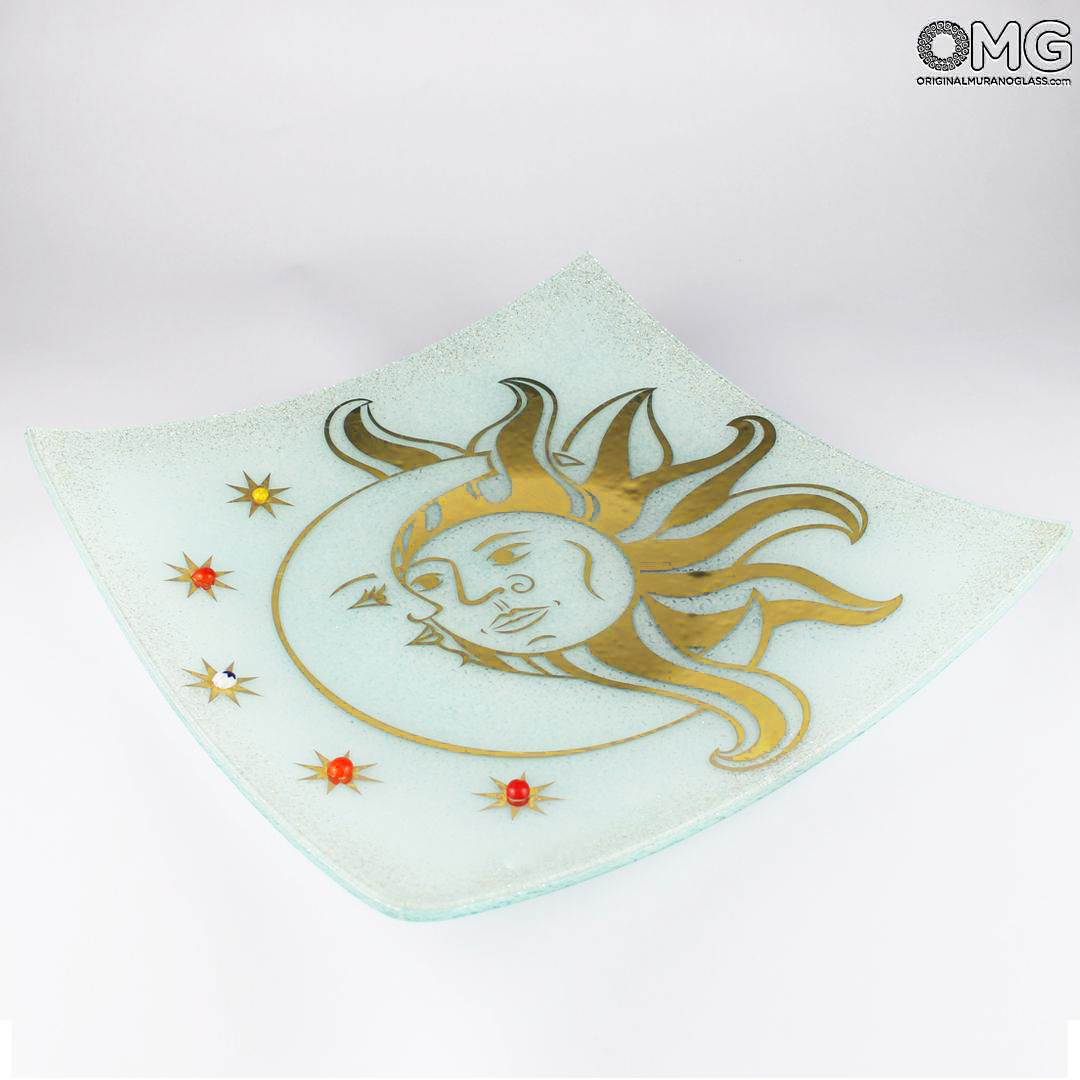 El famoso y colorido plato «Sol y Luna», elaborado con la técnica de la fusión de vidrio, utilizando murrine millefiori de Murano y pan de oro. Un plato sin fondo muy versátil, perfecto para decorar cualquier estantería o mesa.