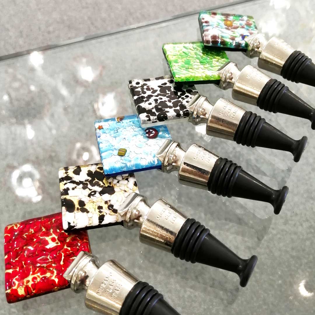 Tapón para botella hecho a mano con la técnica de fusión del vidrio en vidrio de Murano original, con la incorporación de pequeños fragmentos de vidrio y millefiori azul.