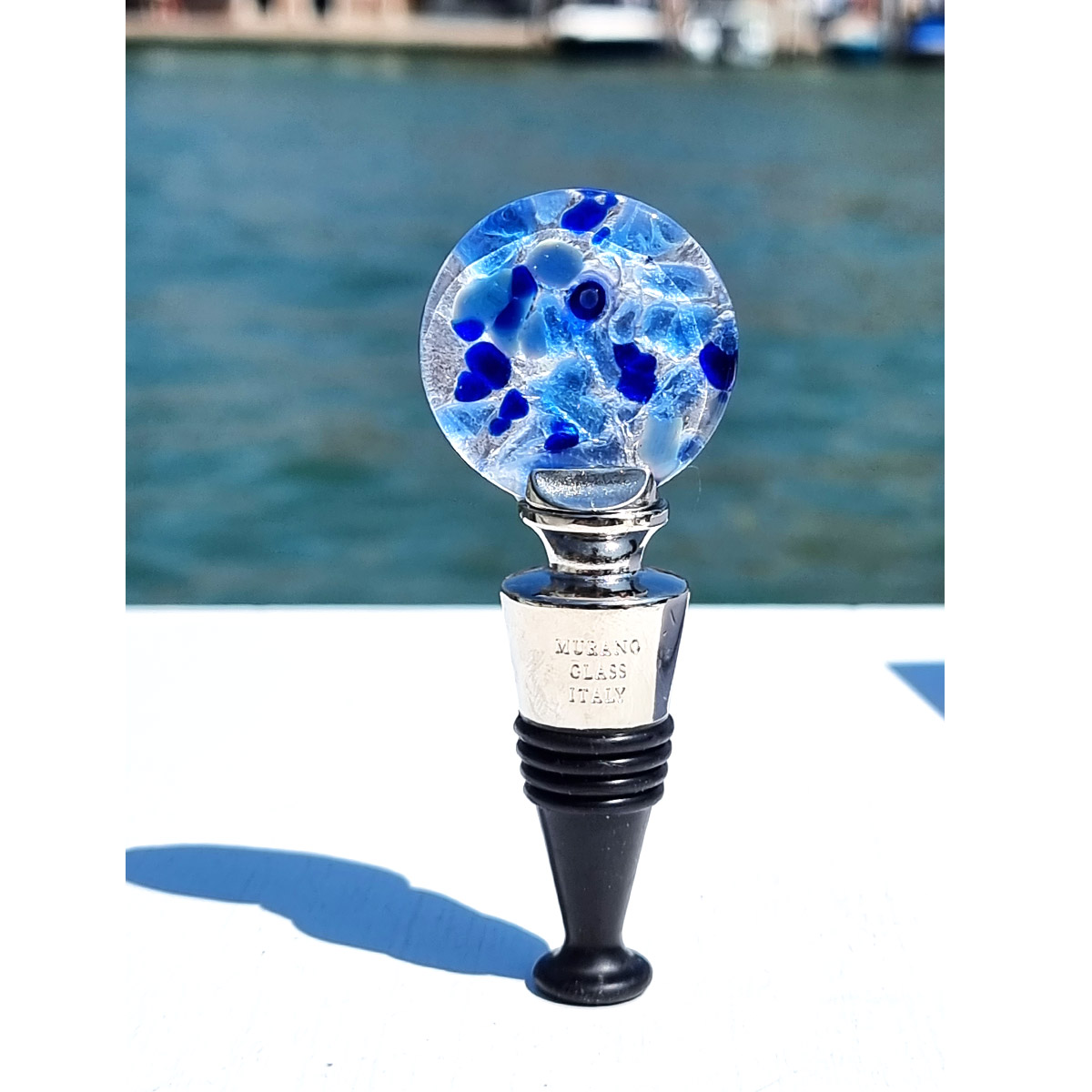 Tapón para botella hecho a mano con la técnica de fusión del vidrio en vidrio de Murano original, con colores azules, milflores y plata.