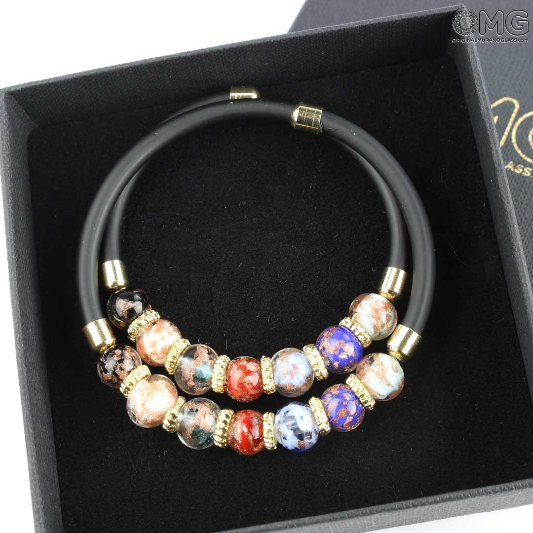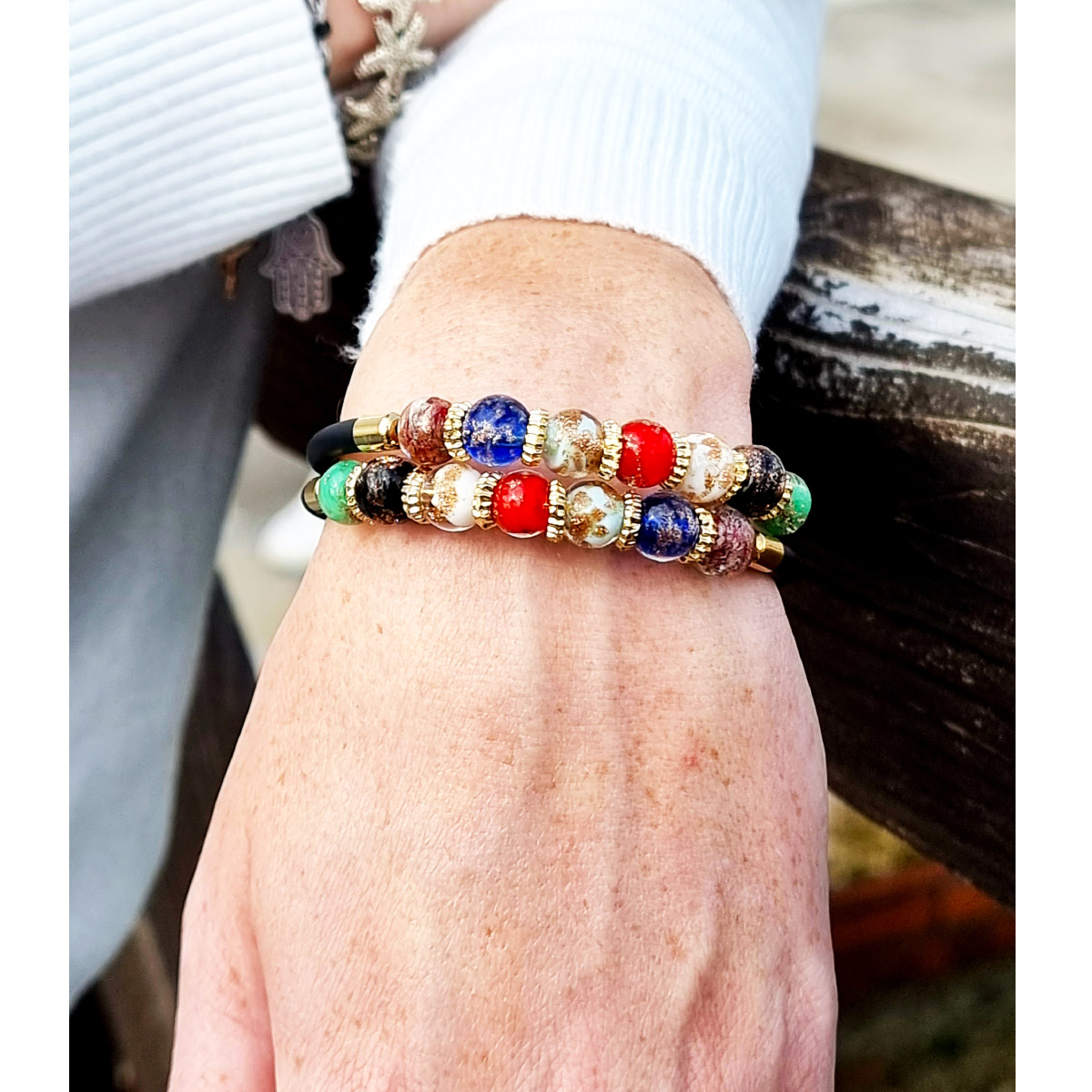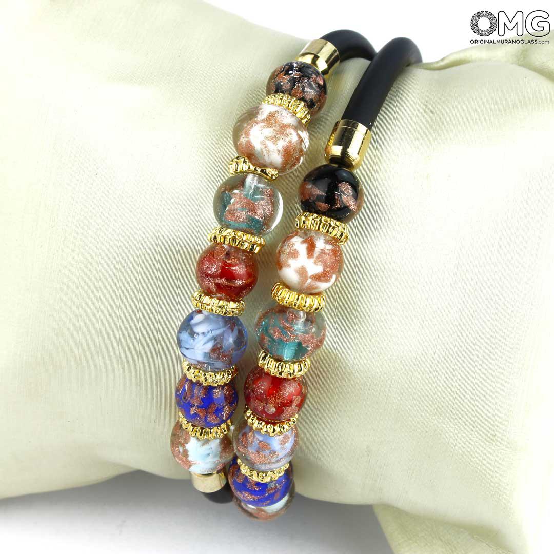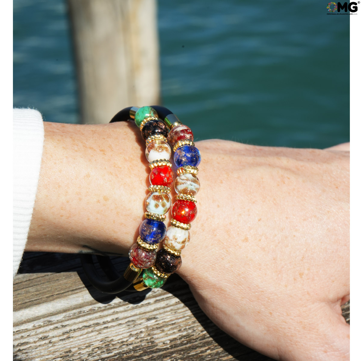 Each bead is handcrafted individually from molten Murano glass and embellished with different colors and sparkling avventurina. The double-strand design makes this Murano glass bracelet a perfect piece of jewelry for every occasion, whether you need something refined for an elegant event or stylish for everyday wear.