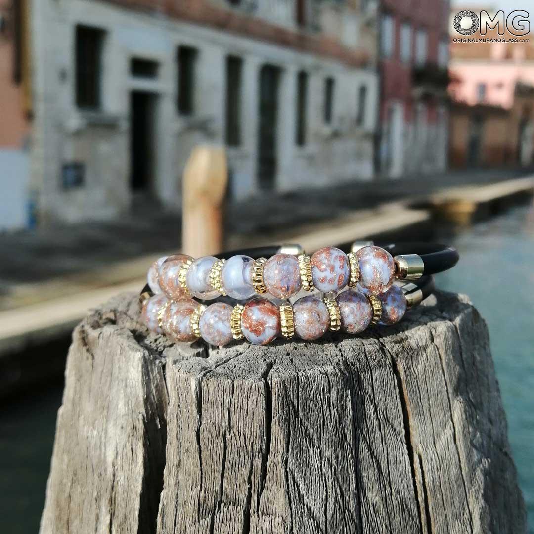 La pulsera de cristal de Murano «Serena Double» está hecha a mano mediante la técnica tradicional del soplado con soplete.