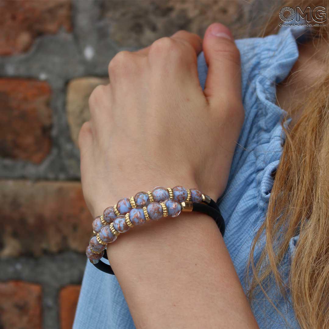 Each bead is handcrafted individually from molten Murano glass and embellished with different shades of violet and sparkling avventurina. The double-strand design makes this Murano glass bracelet a perfect piece of jewelry for every occasion, whether you need something refined for an elegant event or stylish for everyday wear.