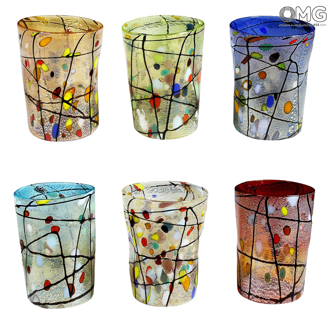 Hand-blown Murano glass Venetian tumblers with pure silver. Decoration inspired by Vassily Kandinsky’s abstract art.