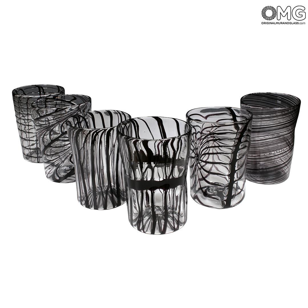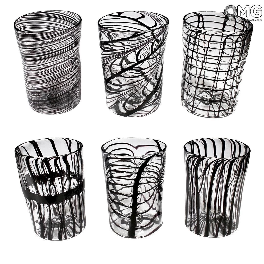 Set of 6 glasses in completely blown and handmade by famous Murano glass-masters in clear crystall glass and black strips.