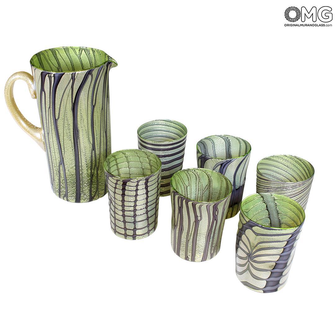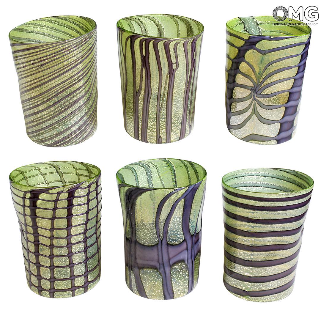 Set of 6 glasses in completely blown and handmade by famous Murano glass-masters, with pure silver on surface.