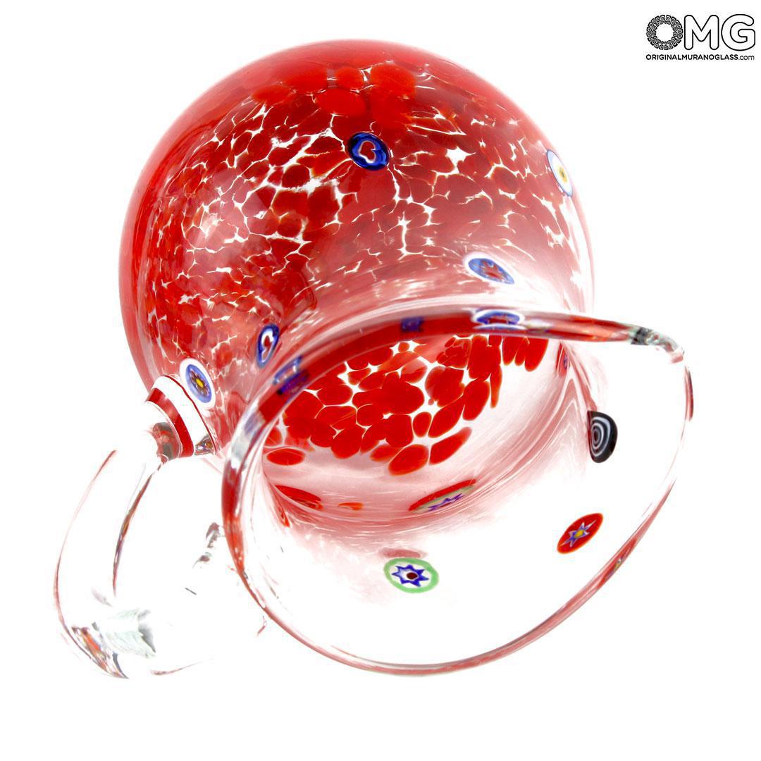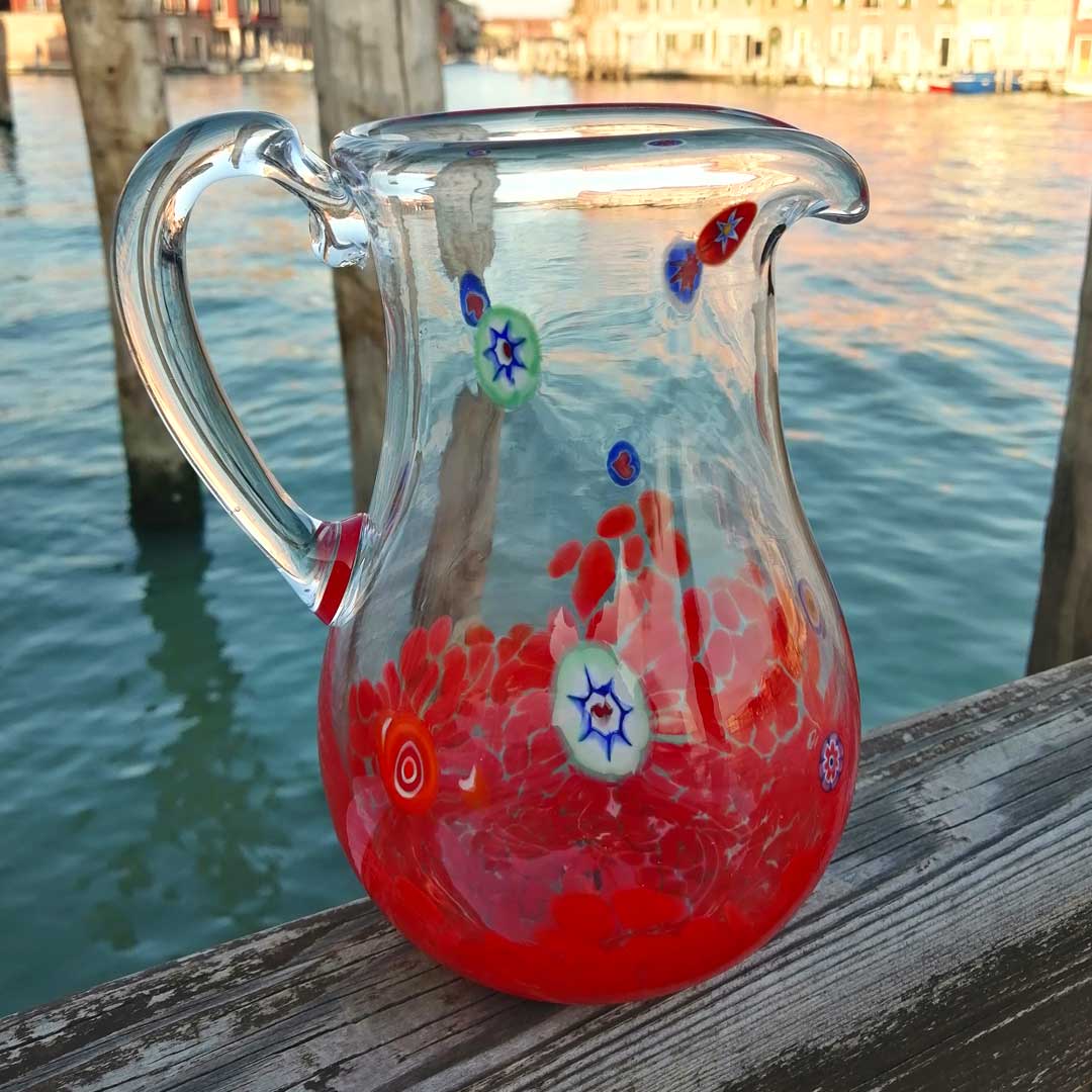 This carafe is made with the technique of glass blowing with murrina decoration and the use of macete, little pieces of glass used to give colors