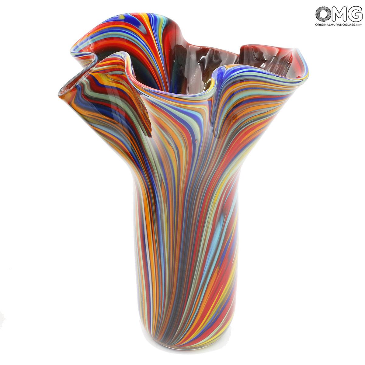 This vase is part of our great glass collection called Missoni, the venetian glass vase is perfect for any home decor, glass vase for flowers with strong impact in any room, the color is shining multicolor glass. The composition of the surface effect color is always different in each piece, the colors used are little glass pieces in green, yellow, blue, red, orange molten togheter to give a perfect combination of mixed glass colors.