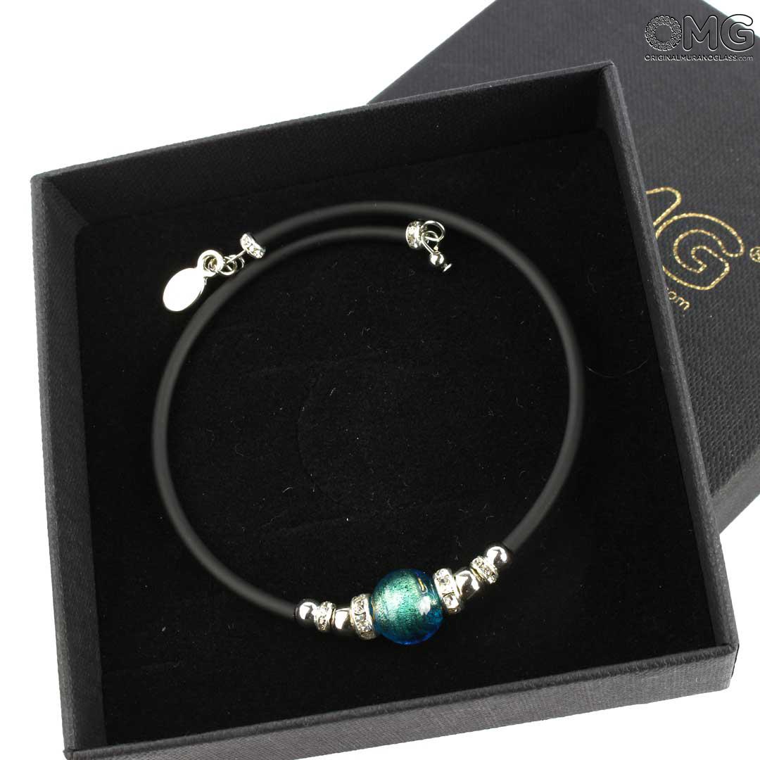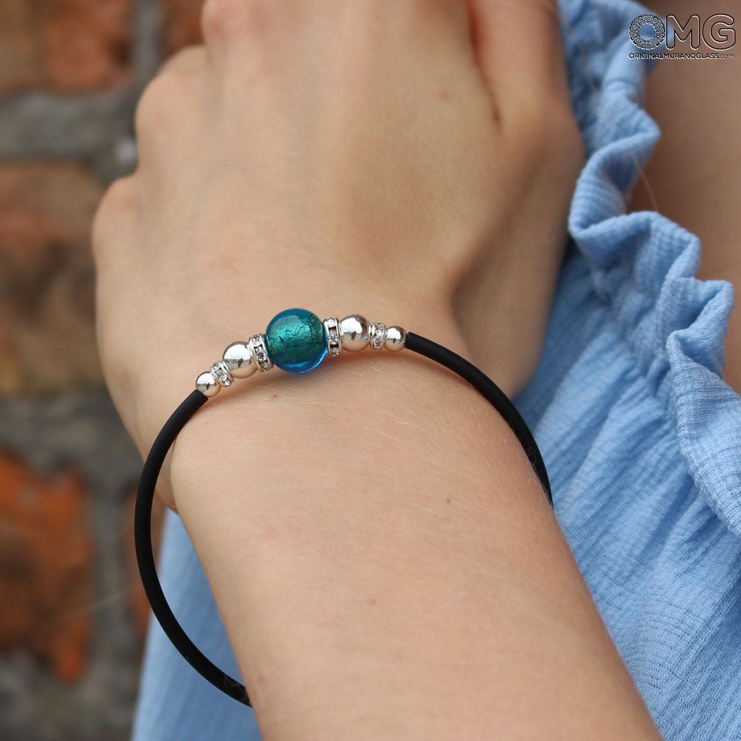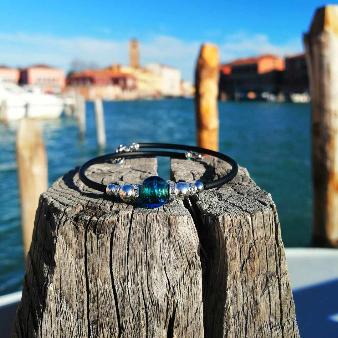 La pulsera de cristal de Murano «Perla Smeraldo Green» está hecha a mano mediante la técnica tradicional del soplado con soplete.