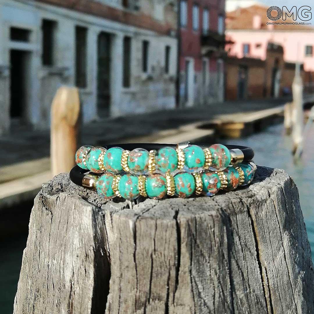 Each bead is handcrafted individually from molten Murano glass and embellished with different shades of marine green and sparkling avventurina. The double-strand design makes this Murano glass bracelet a perfect piece of jewelry for every occasion, whether you need something refined for an elegant event or stylish for everyday wear.