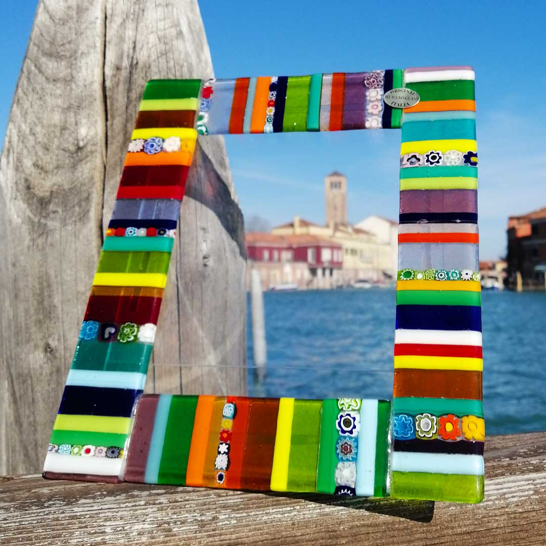 Marco de fotos elaborado con la técnica del fusing de vidrio. Un marco con una textura elegante, adornado con murrinas, millefiori y tiras de vidrio de colores.