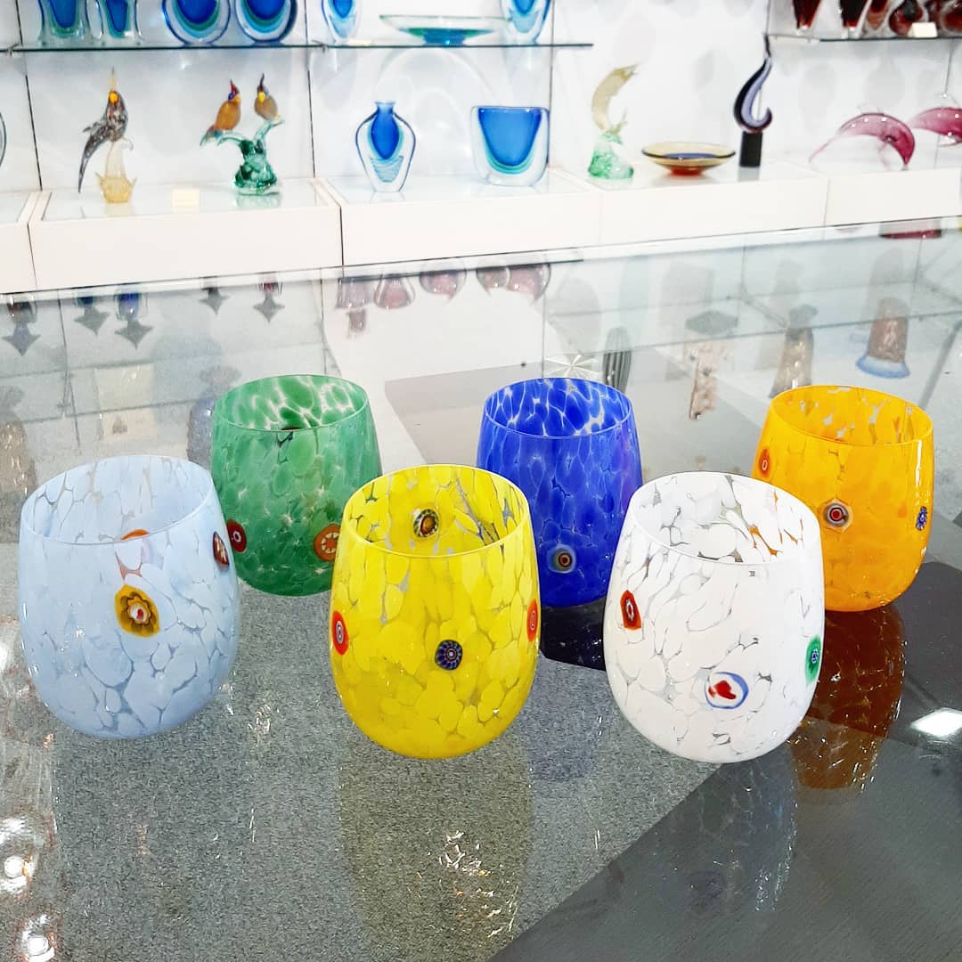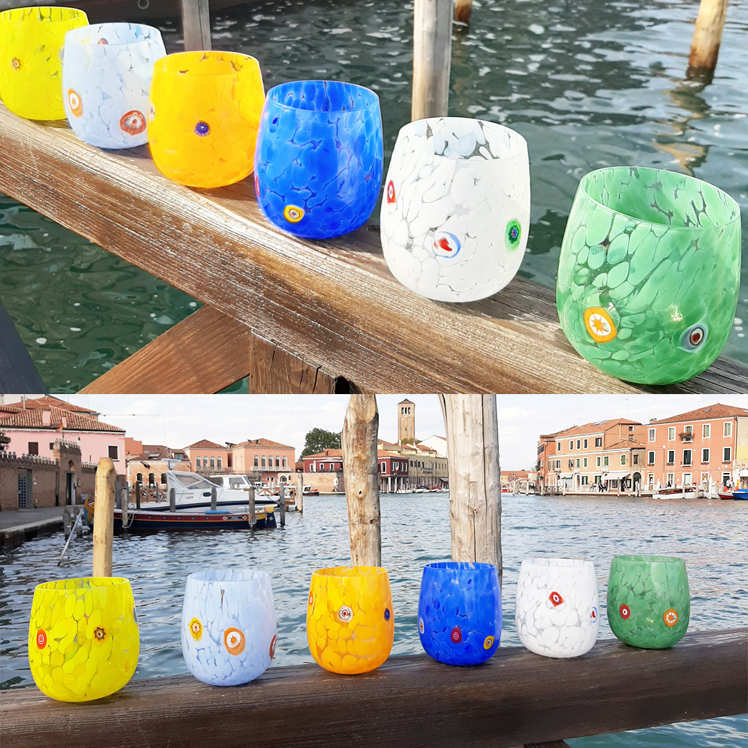 These glasses are also know as "Goto da fornase", the tradition says in fact that Glass Masters uses to drink in this kind of cup during working time in Furnace, made by themself. Note: the set is always differents of the one in photos, we do not use stamps, and colors are mix and random texture for each piece.
