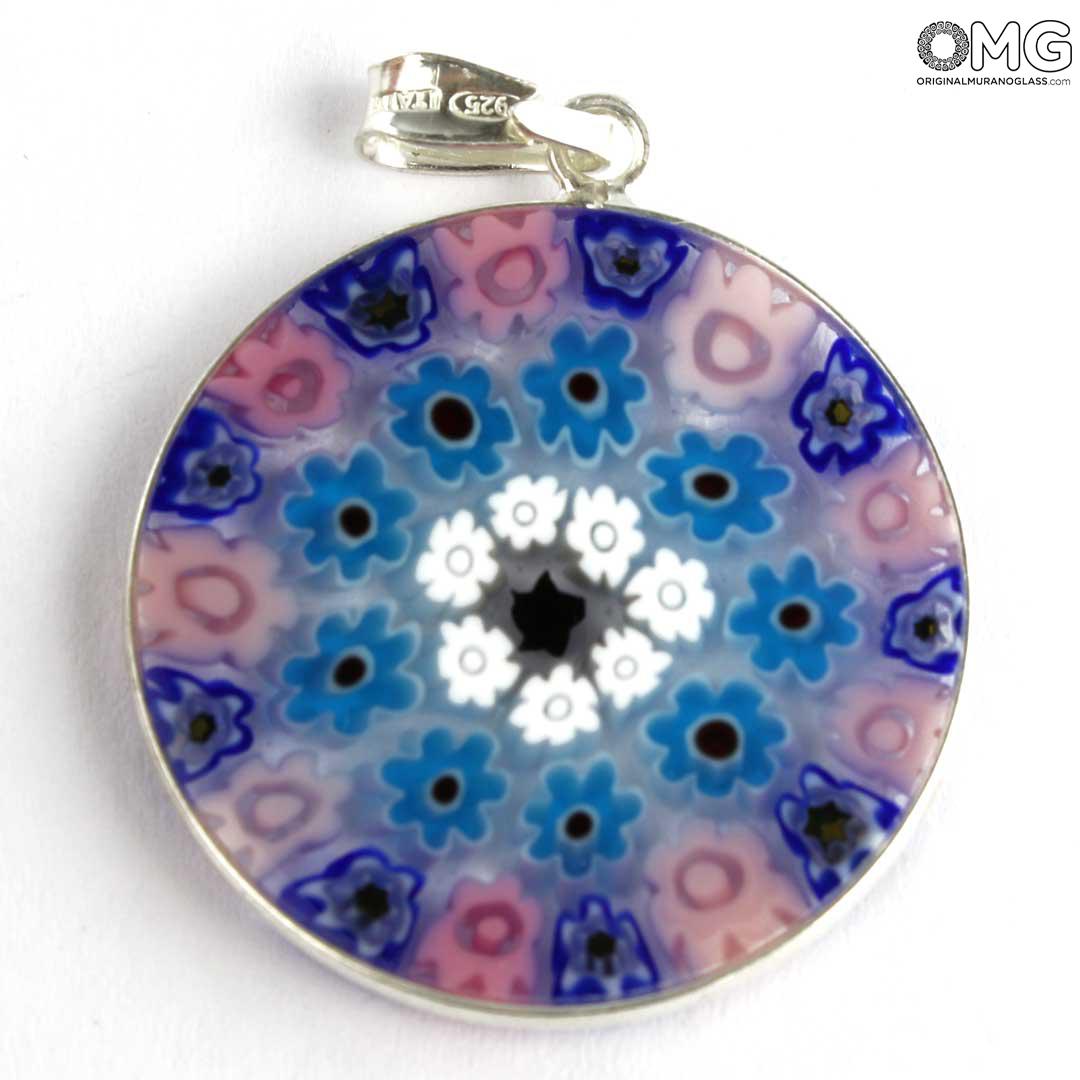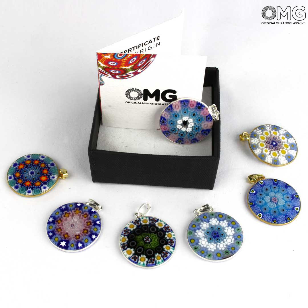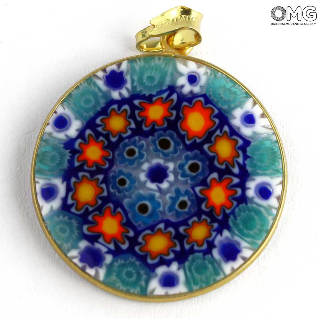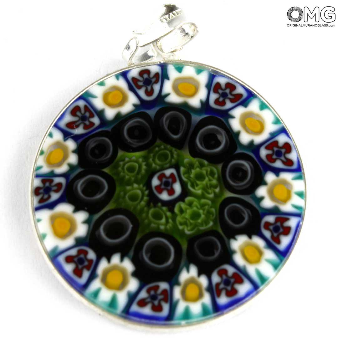 This Murano glass pendant is handmade using the characteristic Murano glass technique Millefiori Murrina (a thousand flowers), which is one of the trademark of Murano glass making. The Murano glass accessory features a symmetric eye-catching pattern of colorful stylized flowers.
