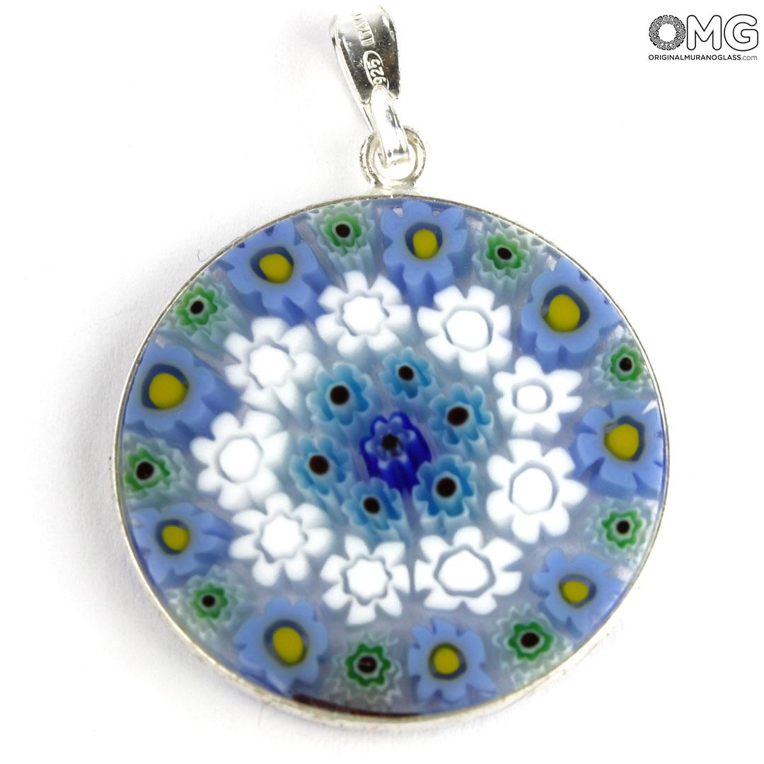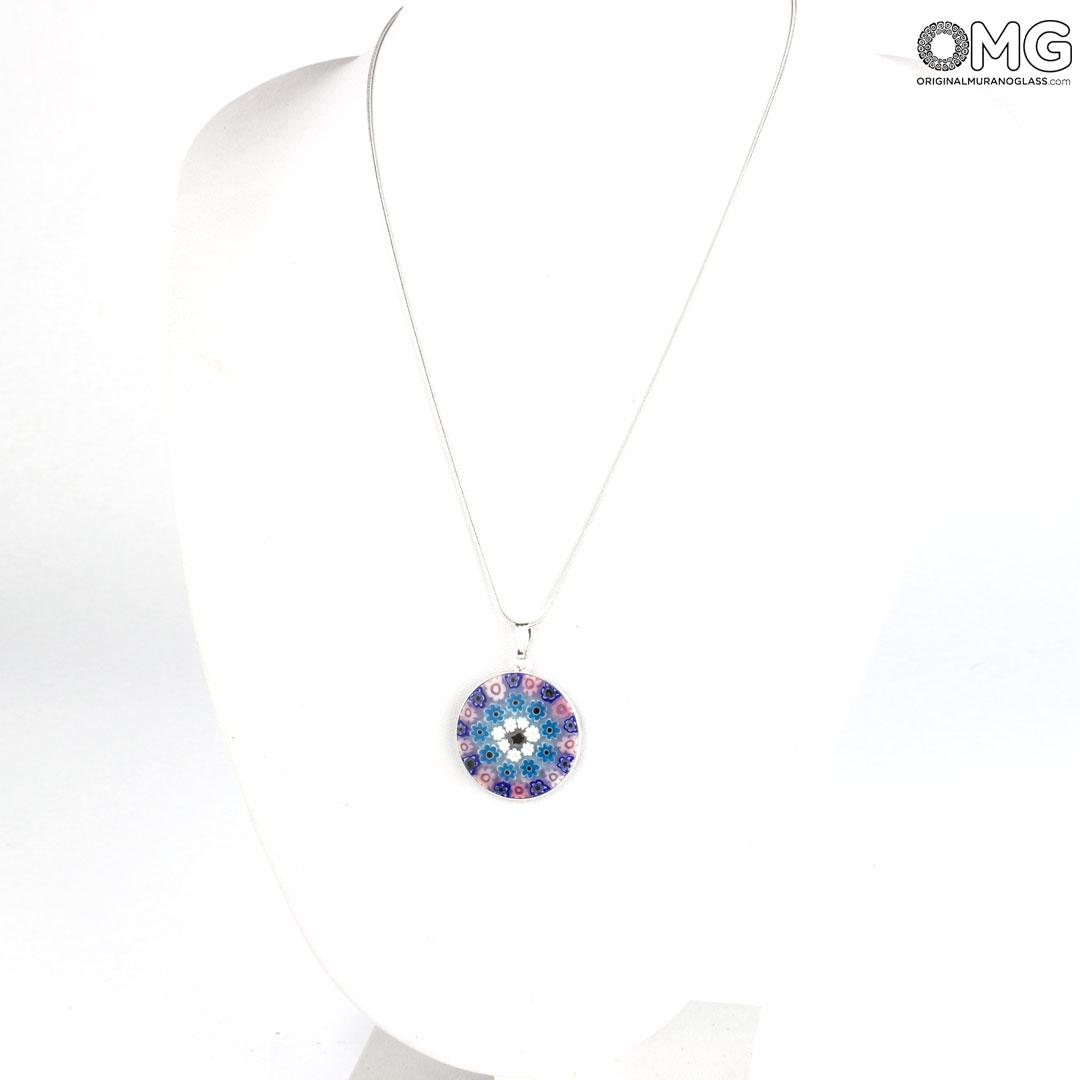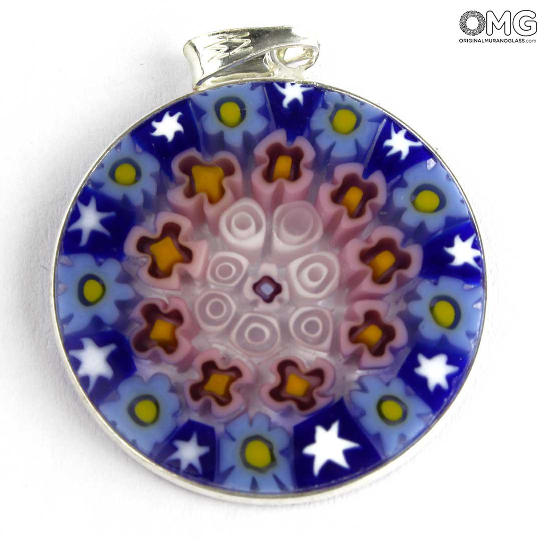 This Murano glass pendant is handmade using the characteristic Murano glass technique Millefiori Murrina (a thousand flowers), which is one of the trademark of Murano glass making. The Murano glass accessory features a symmetric eye-catching pattern of colorful stylized flowers.