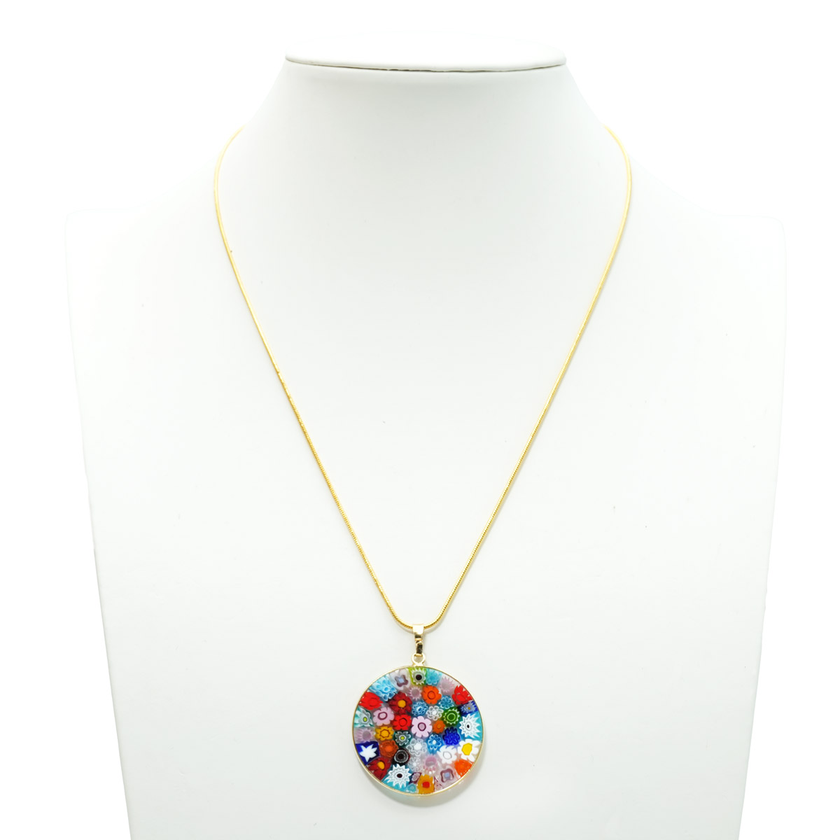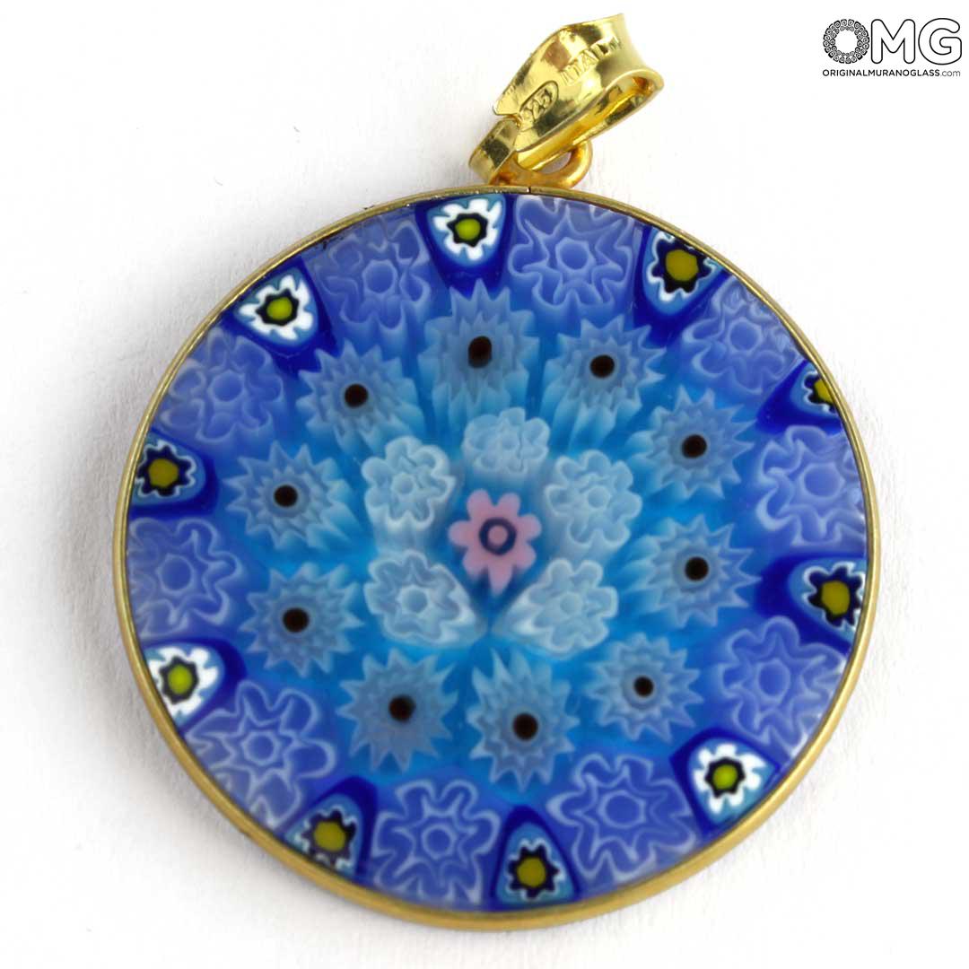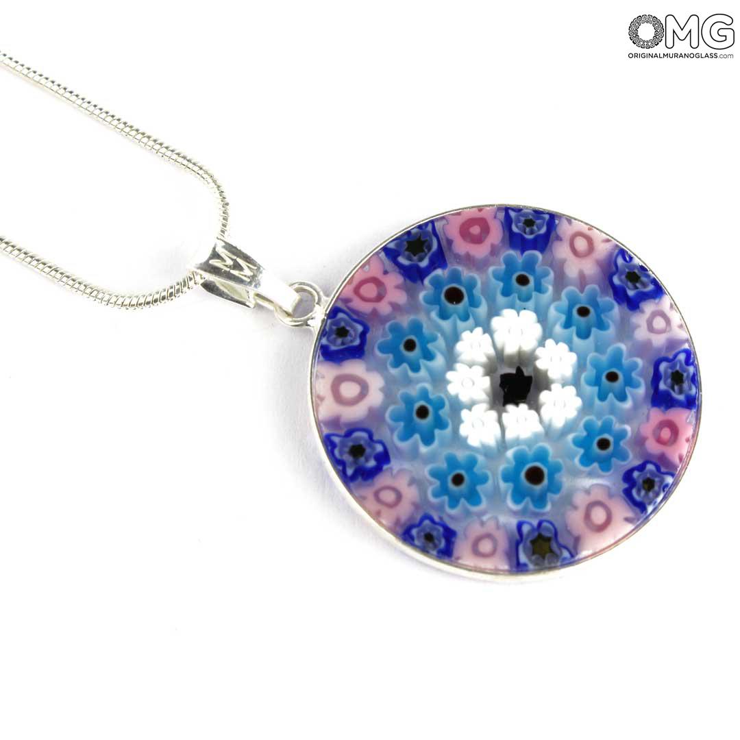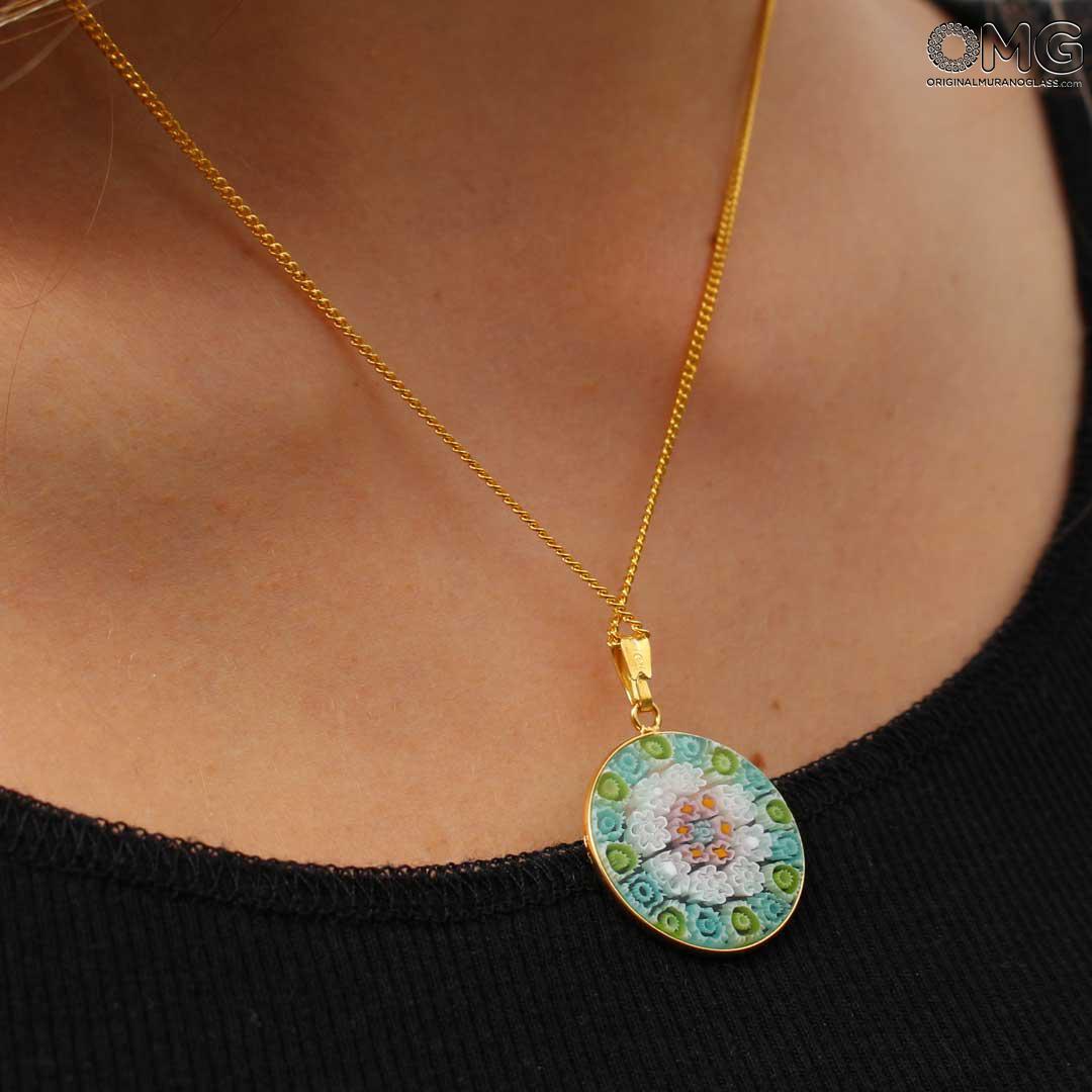 This Murano glass pendant is handmade using the characteristic Murano glass technique Millefiori Murrina (a thousand flowers), which is one of the trademark of Murano glass making. The Murano glass accessory features a symmetric eye-catching pattern of colorful stylized flowers.