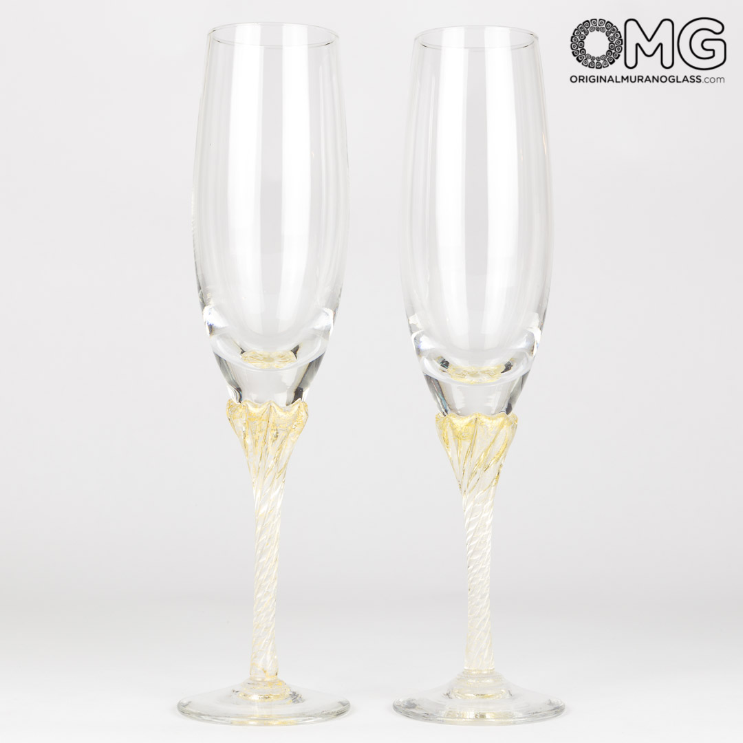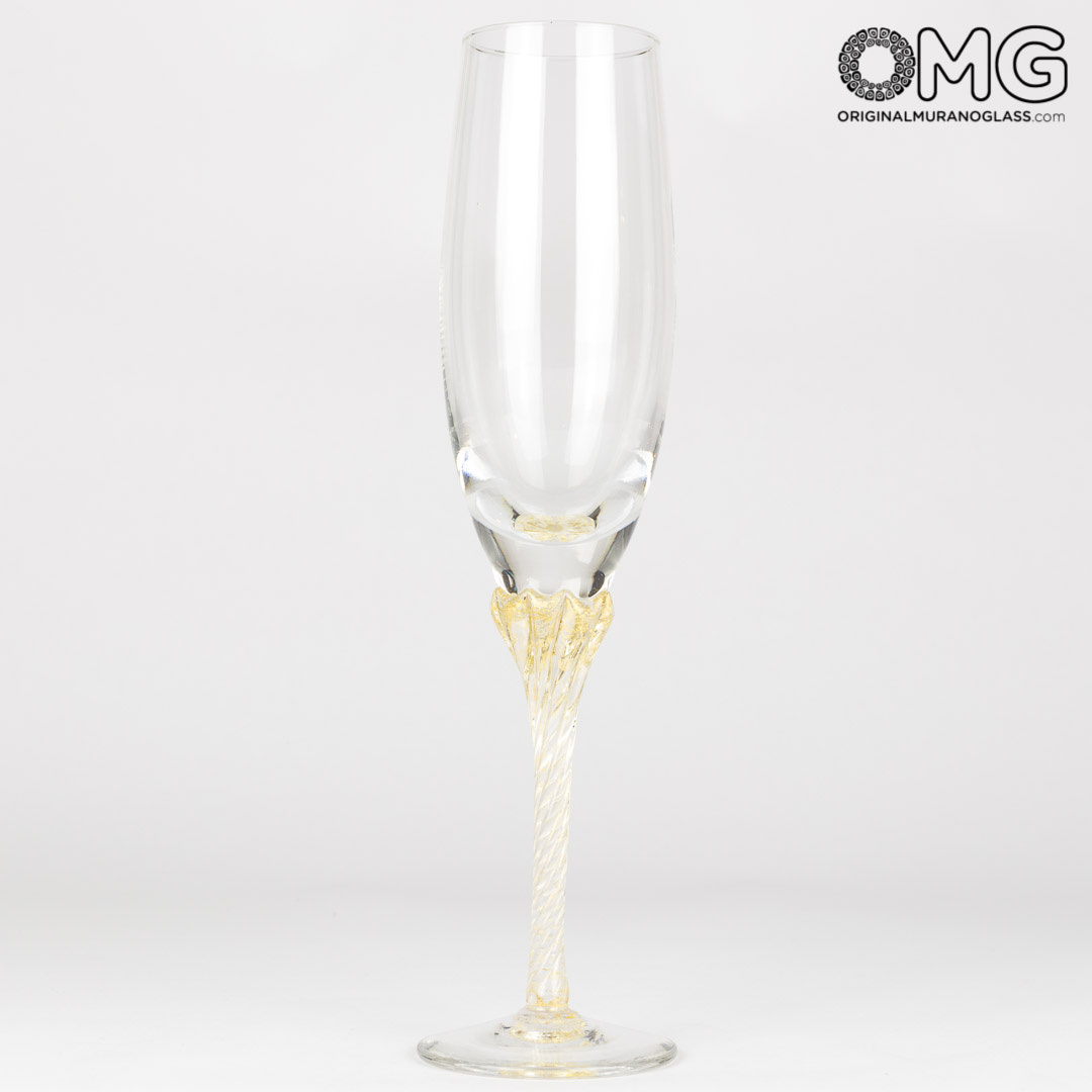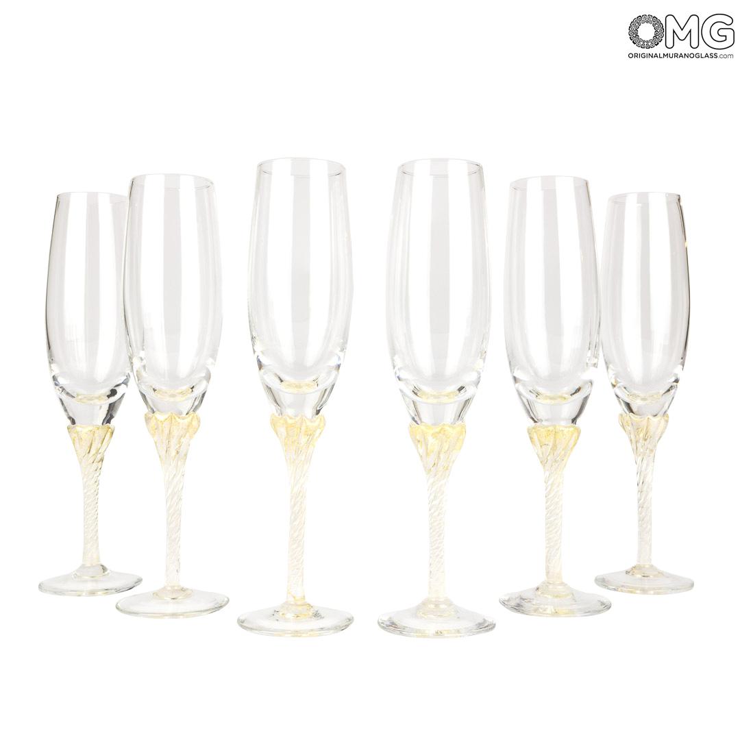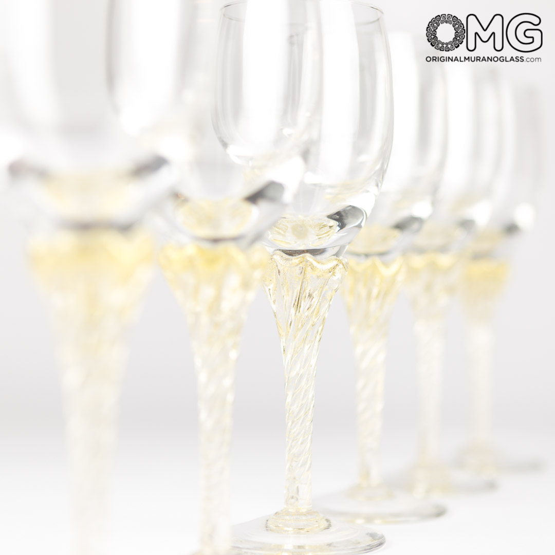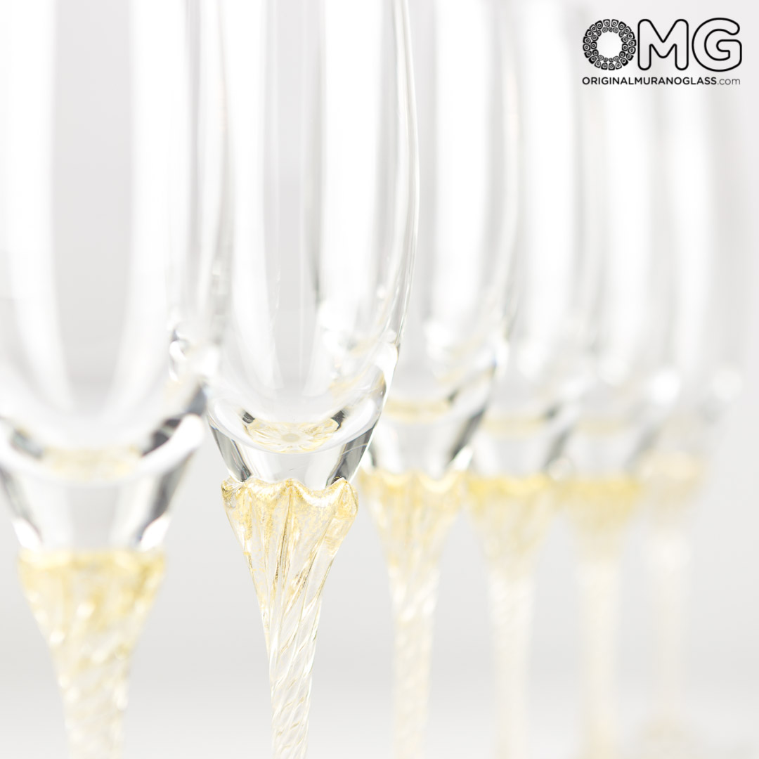 Very nice set of 6 flute glasses suggested for sweet muscat wine for desert. All items are in different unique handmade with glass and gold leaft 24kt. Made by blown glass technique. Elegant and preciose artworks pieces. Not stamp, but each Champagne Flute of this collection is an unique piece handmade.
