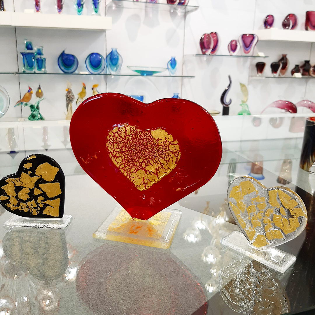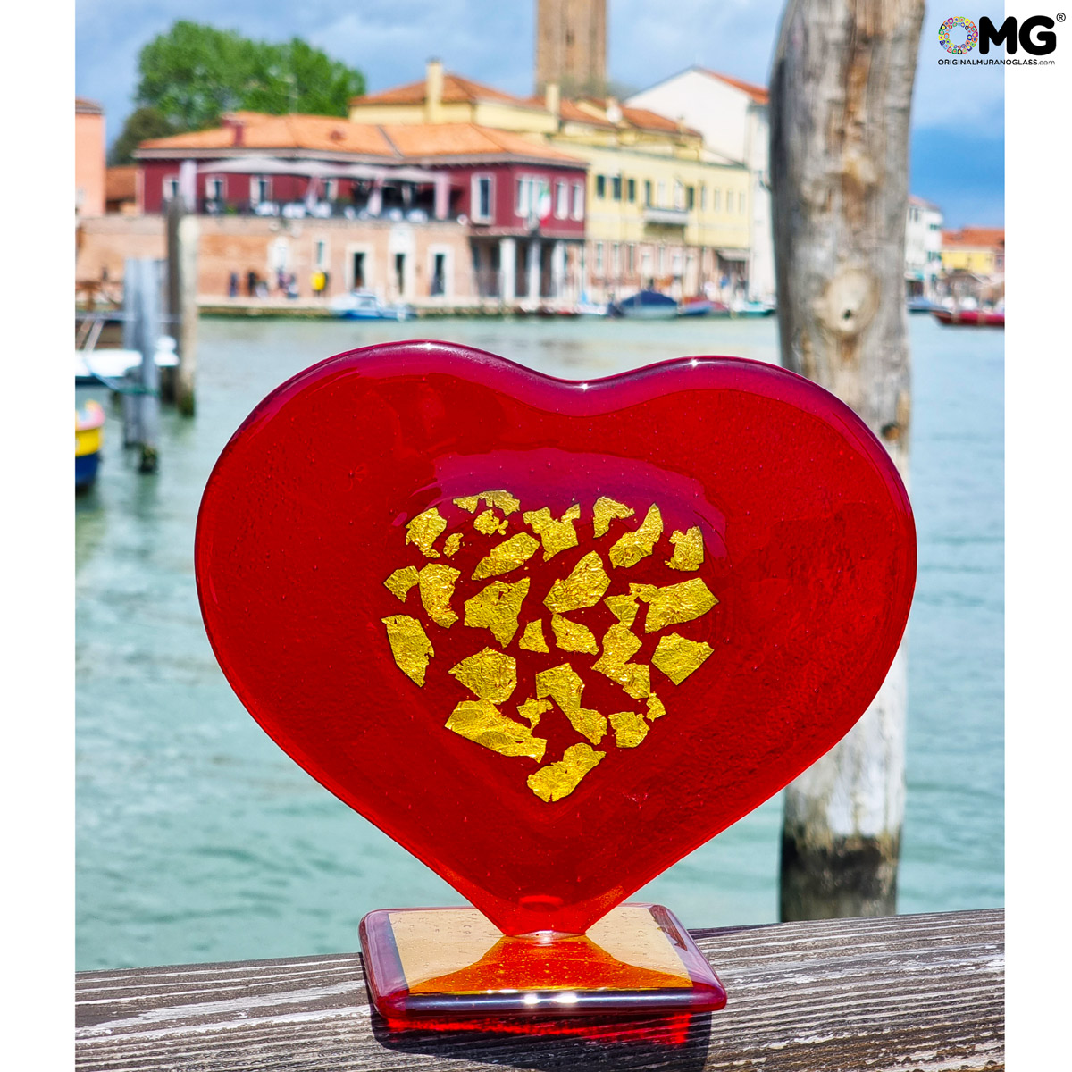 This authentic Murano glass sculpture is handmade using the traditional glass fusing technique. The red glass heart contains a delicate gold leaf 24 kt while the base is crystal clear enriched with gold, creating a luminous and refined piece of art.