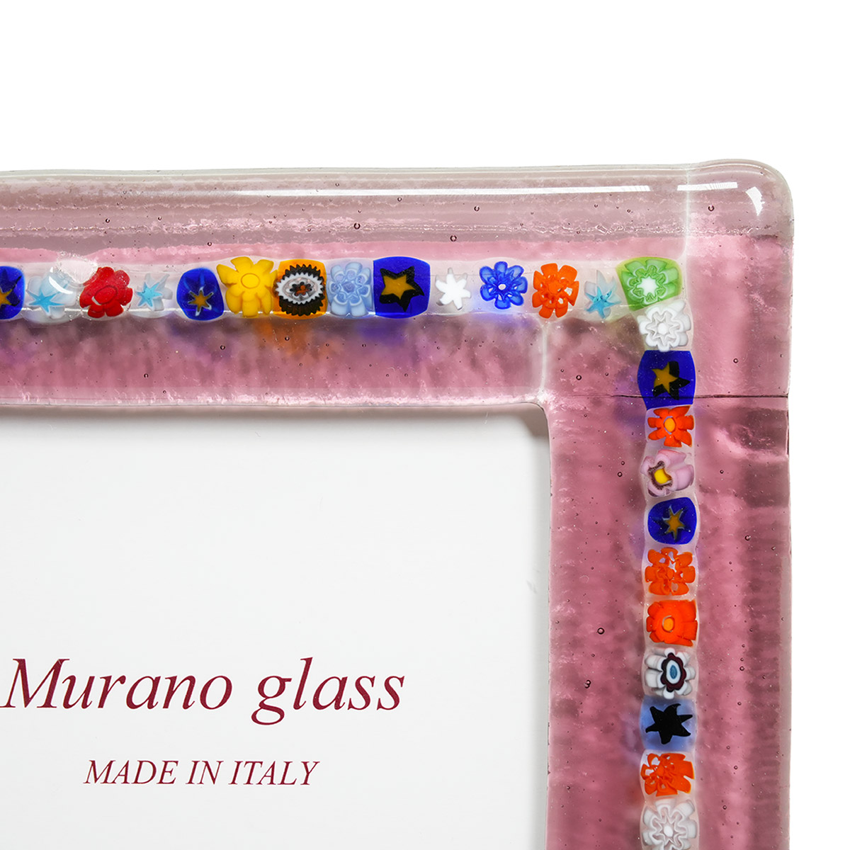 Marco Lillac decorado con un borde de murrina, elaborado con la técnica del vidrio fundido. El marco se puede colocar tanto en posición vertical como horizontal. Presenta colores muy vivos que aportan un toque moderno a tus fotografías. Perfecto para guardar tus mejores recuerdos o como idea de regalo acompañado de una bonita foto.