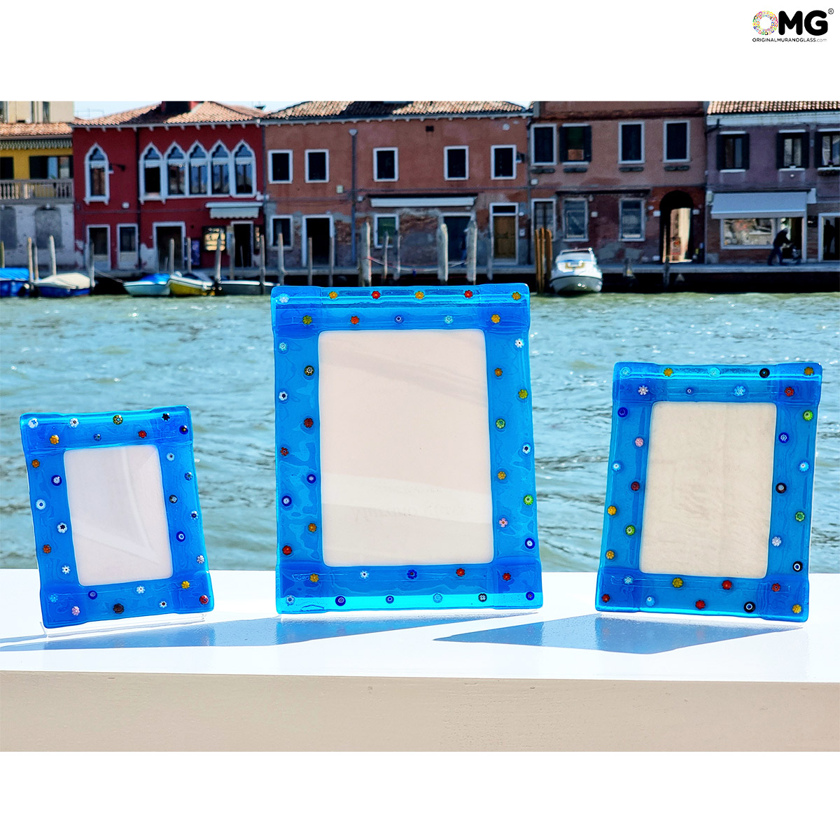 Precioso marco de fotos con decoración de murrina y cristal azul claro. Realizado con la técnica de fusión de vidrio. Perfecto como regalo de boda y para muchas otras ocasiones.