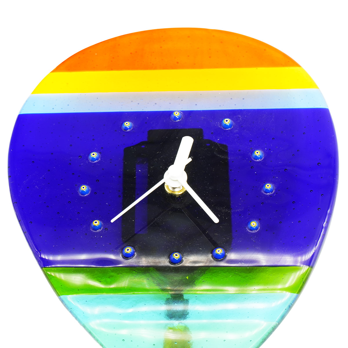 Reloj de pared con péndulo de colores, elaborado con la técnica de fusión de vidrio y milenari. Una obra de arte perfecta para dar un toque de alegría a tu hogar u oficina. También es una idea encantadora para un regalo útil y divertido.