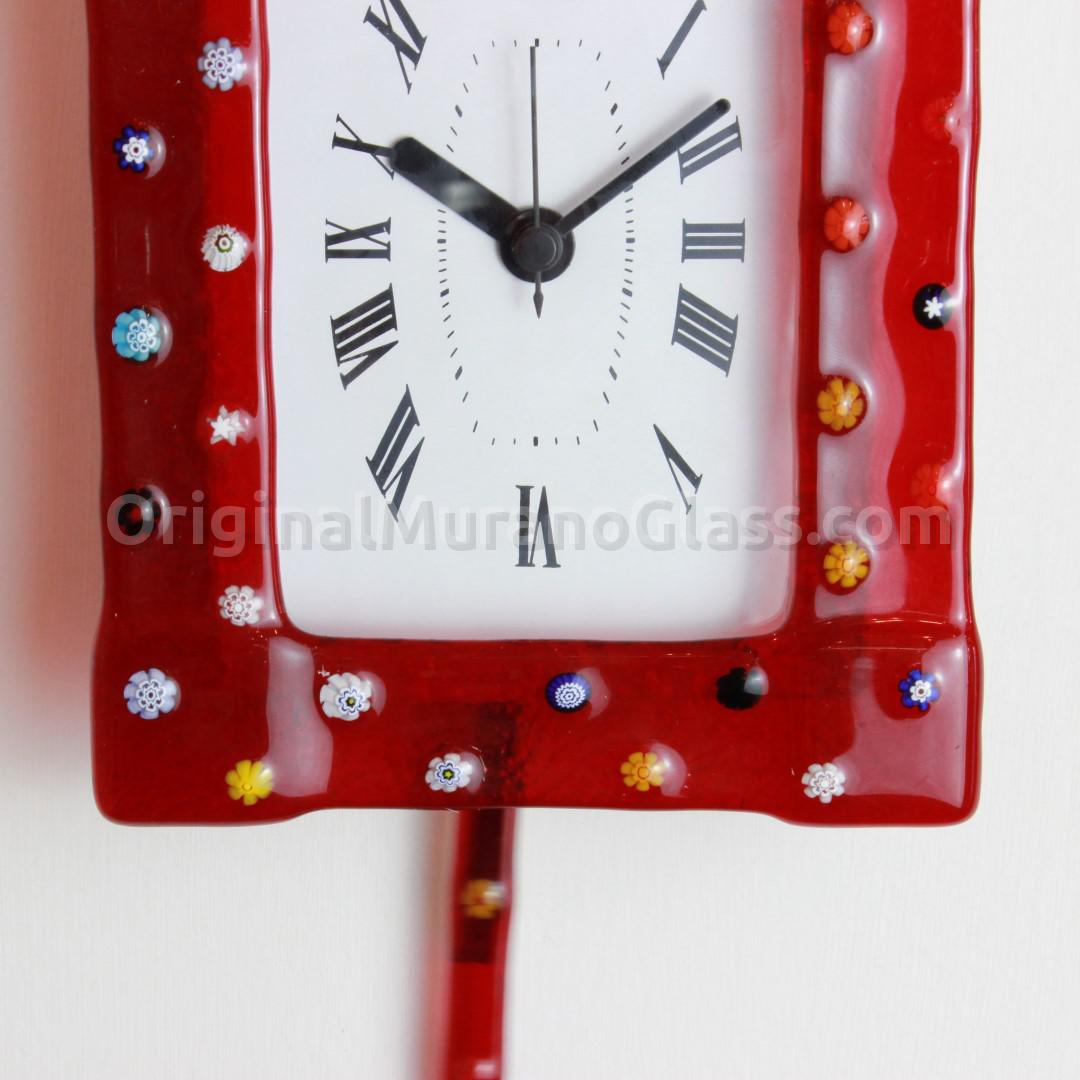 Reloj de péndulo elaborado con la técnica de fusión del vidrio. Reloj rojo con pequeños murrinos en el marco de vidrio.