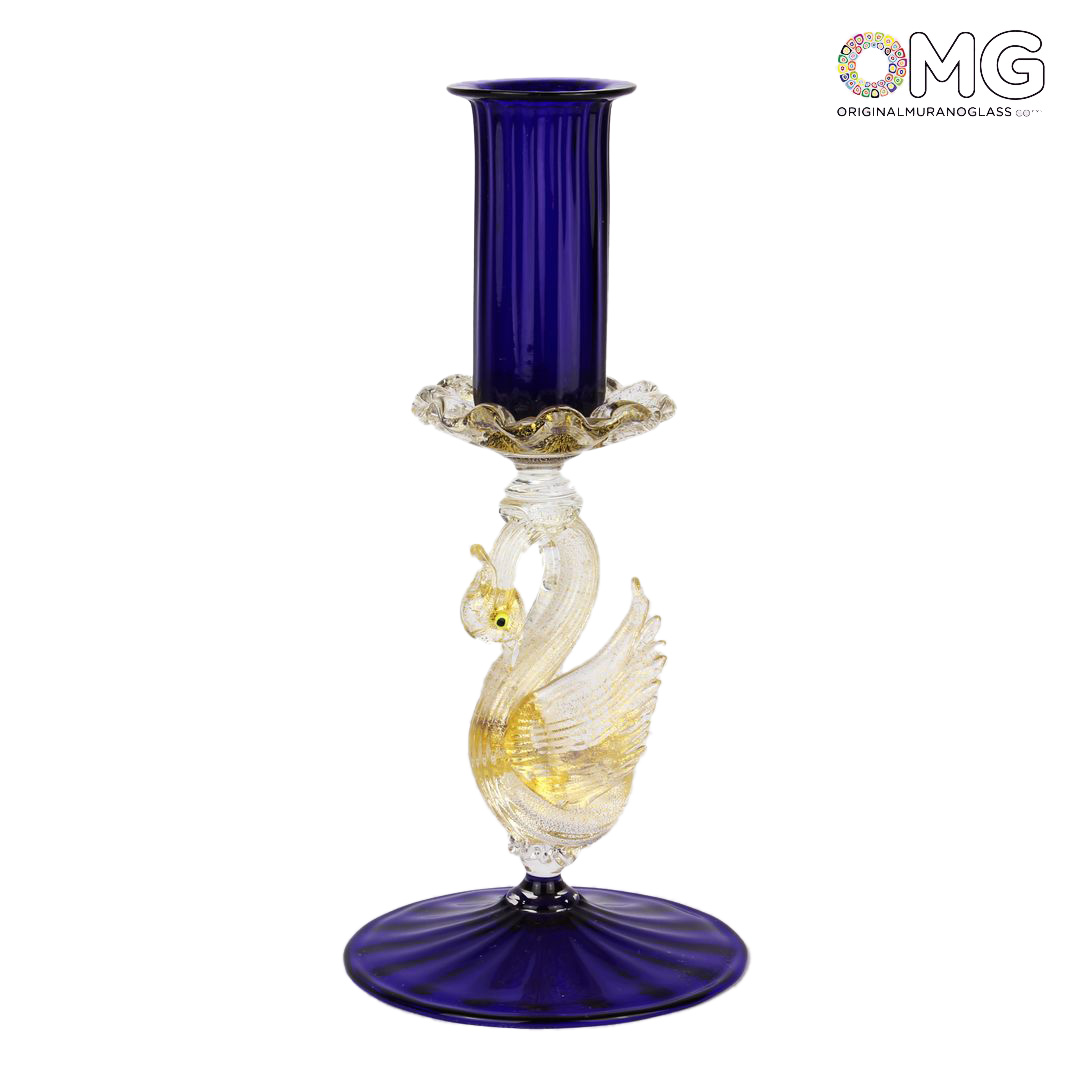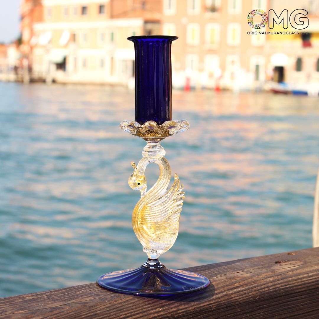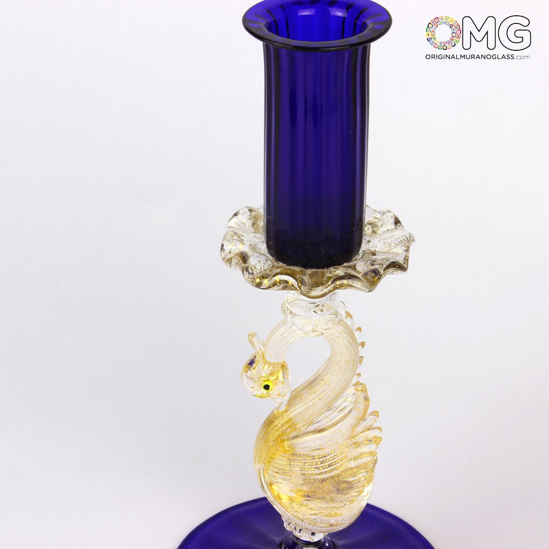 Porta candela dettagliato fatto a mano utilizzando la tecnica di lavorazione tradizionale del vetro di Murano. La parte superiore è in vetro blu, la parte centrale è in vetro di Murano cristallo trasparente con foglia d'oro. Perfetto per le vostre cene a lume di candela con un piccolo tocco veneziano.