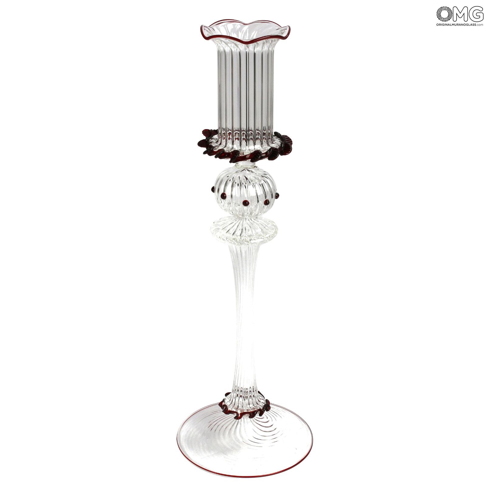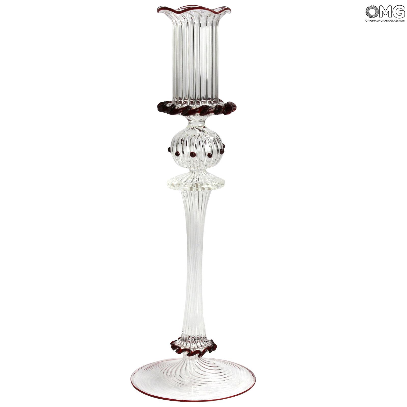 Un bell'esempio della famosa tradizione artistica del vetro di Murano, questo candelabro veneziano realizzato interamente a mano combina un vetro traslucido di eccezionale qualità con splendidi accenti di vetro rosso simili a pizzo.