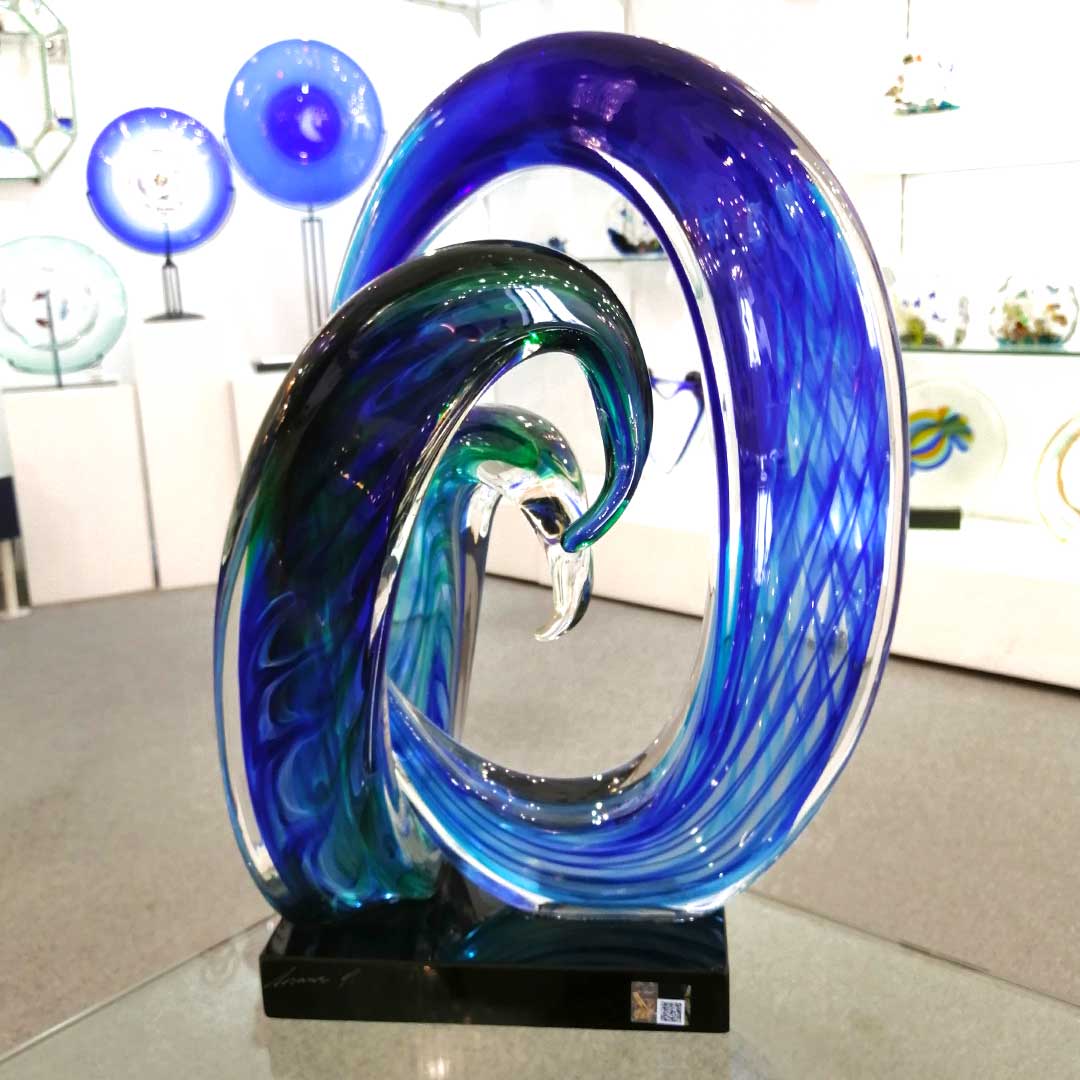 Scultura su base nera realizzata a mano libera con modellazione a caldo. Soggetto astratto-moderno. Sfumature di colori giallo, verde, blu cristallo. Molata e lucidata a mano, pezzo unico non riproducibile. Firmata dal maestro con incisione a freddo.