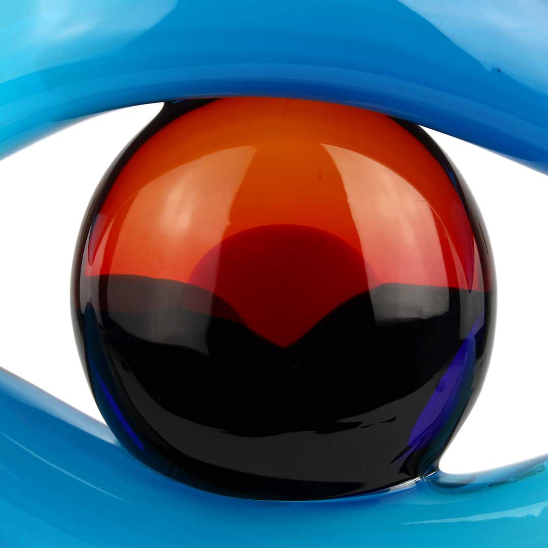Scultura che rappresenta l'occhi della divinità che fluttuano su una base solida. I colori brillanti e le dimensioni la rendono perfetta per l'arredamento della vostra casa moderna. L'oggetto è unico e firmato dal maestro. Vetro Artistico Murano.