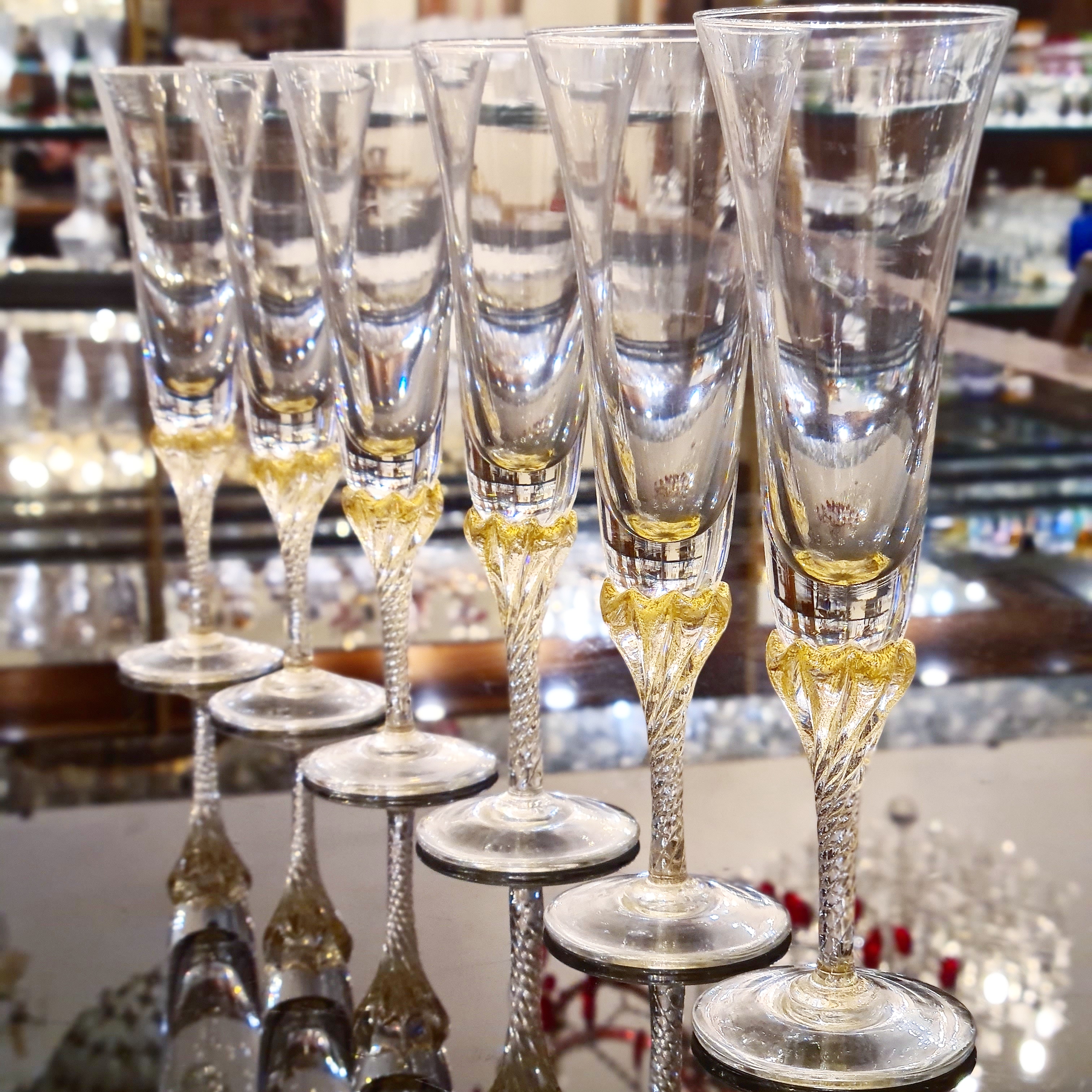 Impressionate i vostri ospiti con questo set da Champagne realizzato con vetro e oro, secondo l'antica tecnica veneziana del vetro soffiato.