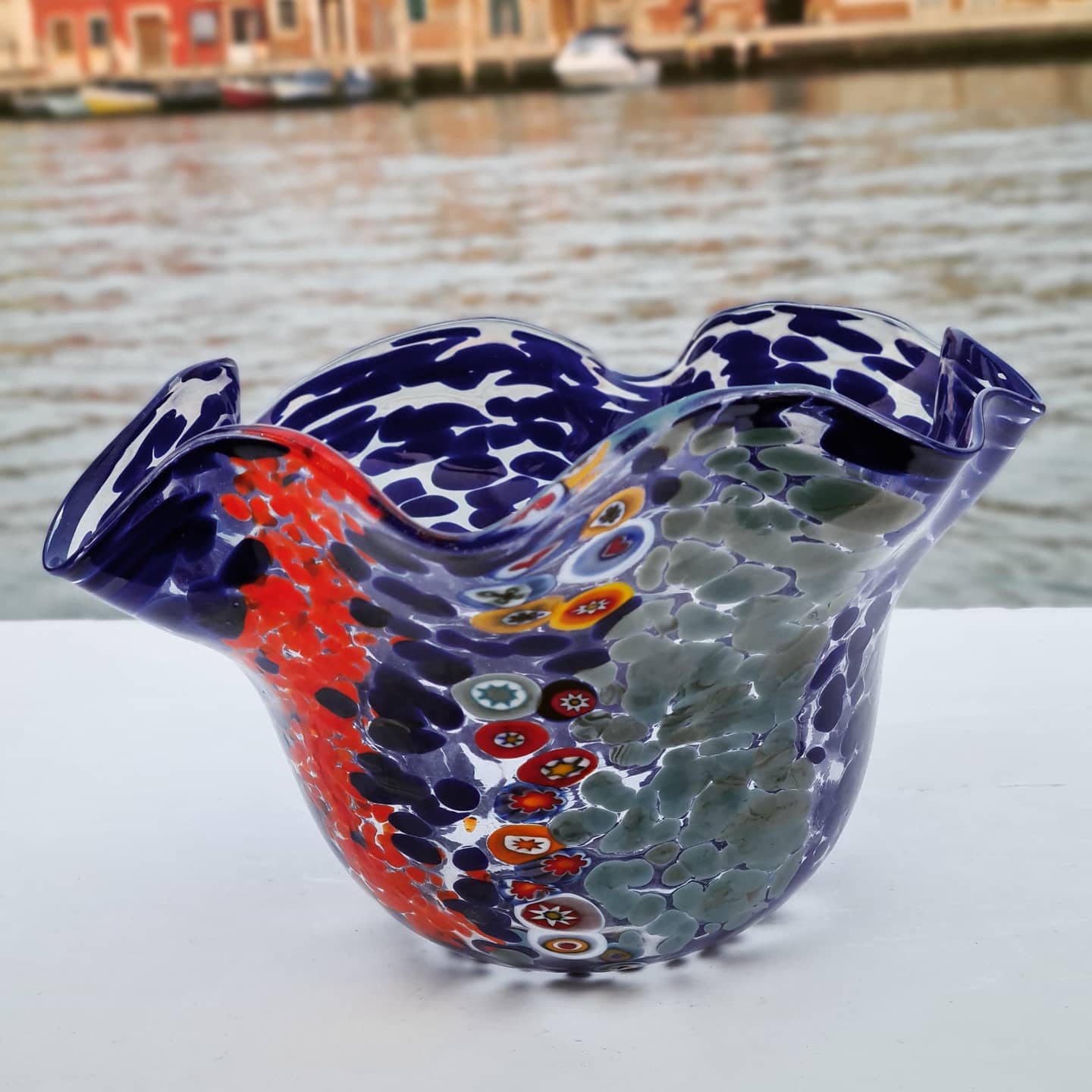 Una piccola ma elegante e vivace ciotola che può essere usata come centrotavola o come svuota tasche. Questa ciotola in vetro di Murano fatta a mano è un vero capolavoro! La combinazione di colori vivaci crea un effetto straordinario. La forma ondulata e organica aggiunge eleganza, mentre le murrine inserite nel vetro donano brillantezza e unicità. È perfetta come centrotavola decorativo, riflettendo la luce in modo spettacolare. La lavorazione è eccellente, un autentico pezzo d’arte veneziana che esalta la maestria degli artigiani muranesi. Consigliatissima per amanti dell’arte e collezionisti!