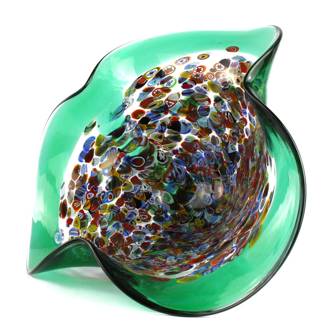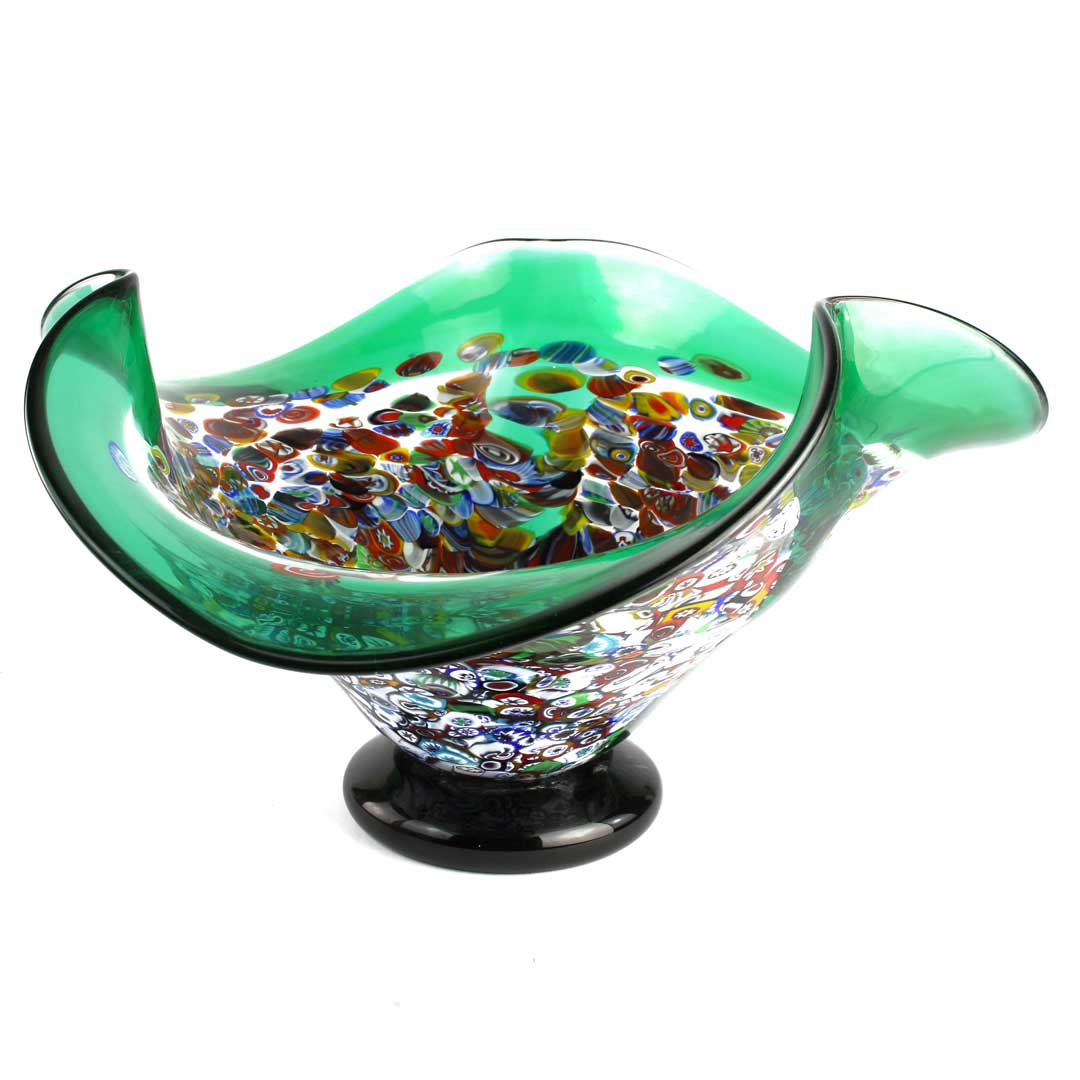 Piatto in vetro soffiato decorato con murrine millefiori e vetro di Murano. Particolare la forma ondulate del bordi. Con il marchio Vetro Artistico® Murano applicato.