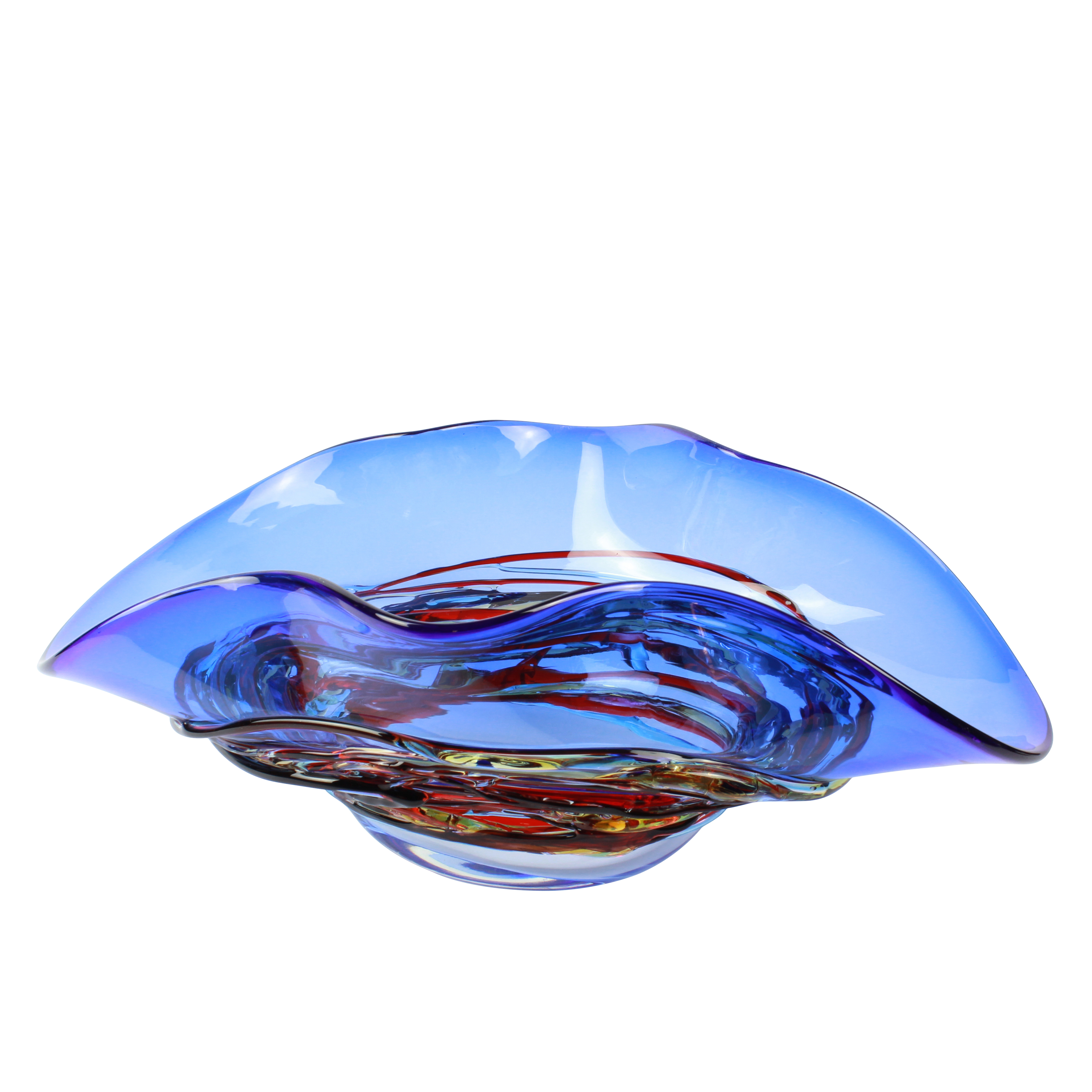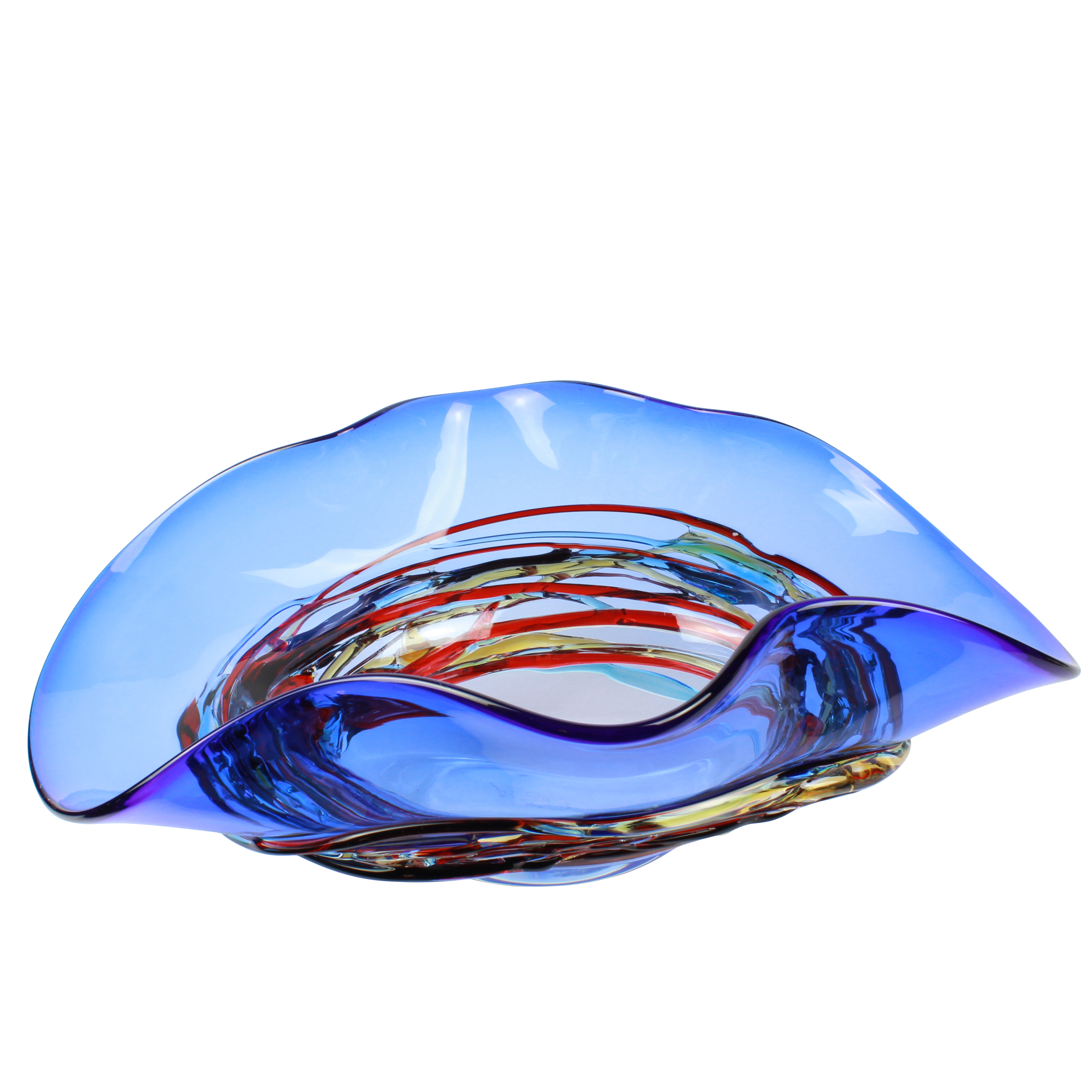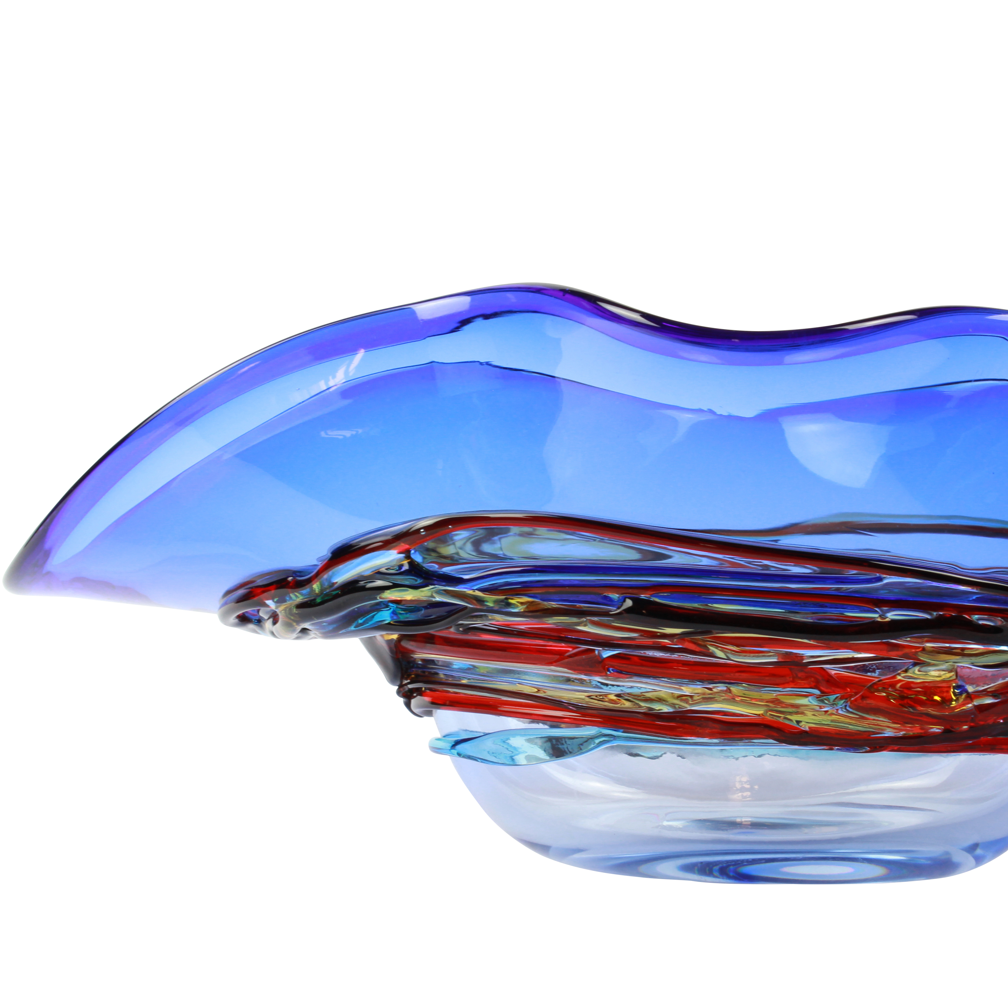 Bellissimo vaso/piatto centrotavola in vetro soffiato con decoro di vetro colato sulla superficie, oggetto molto elegante e di particolare effetto. Lavorato a puntello molato e lucidato a mano. Firmato dal maestro con incisione a freddo