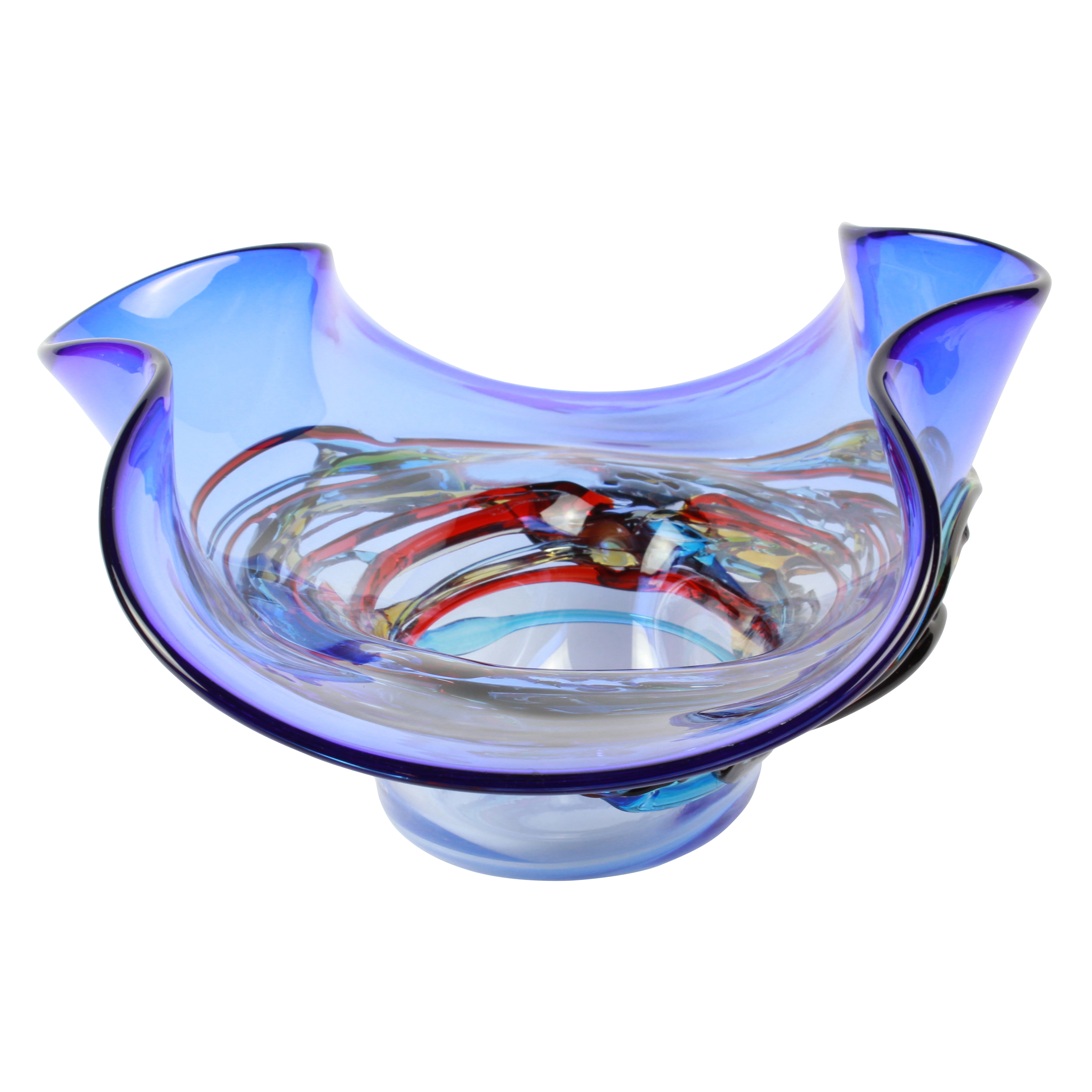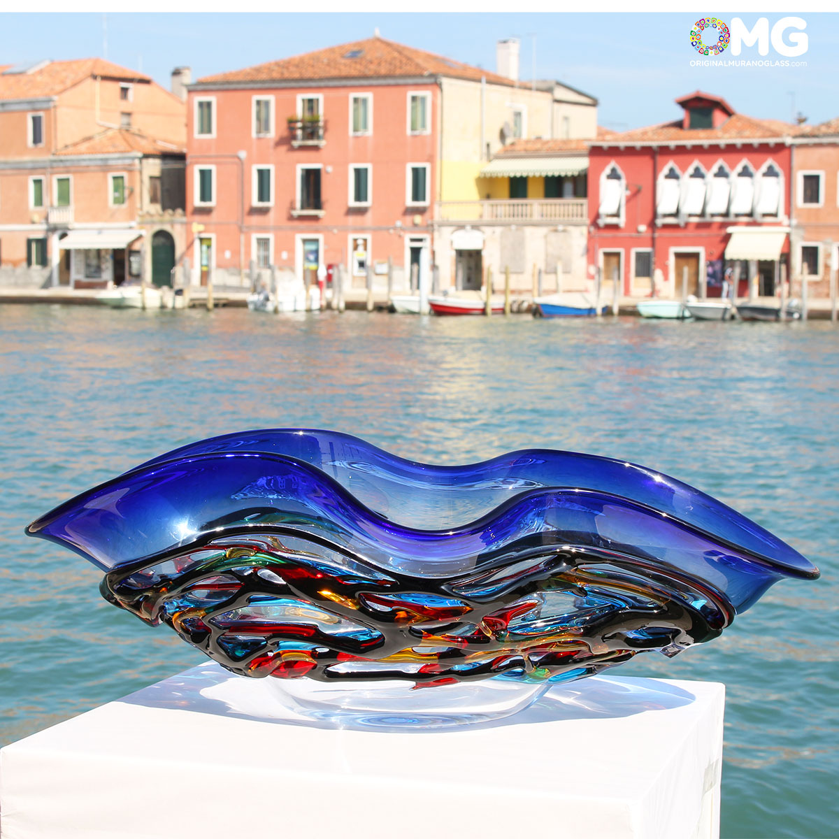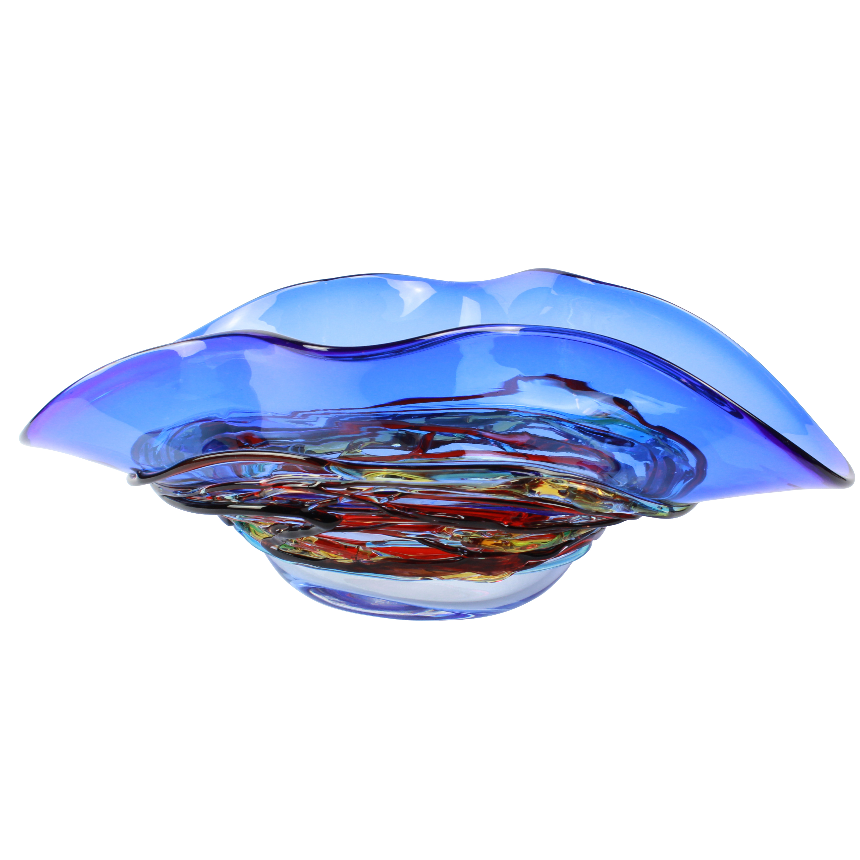 Bellissimo vaso/piatto centrotavola in vetro soffiato con decoro di vetro colato sulla superficie, oggetto molto elegante e di particolare effetto. Lavorato a puntello molato e lucidato a mano. Firmato dal maestro con incisione a freddo