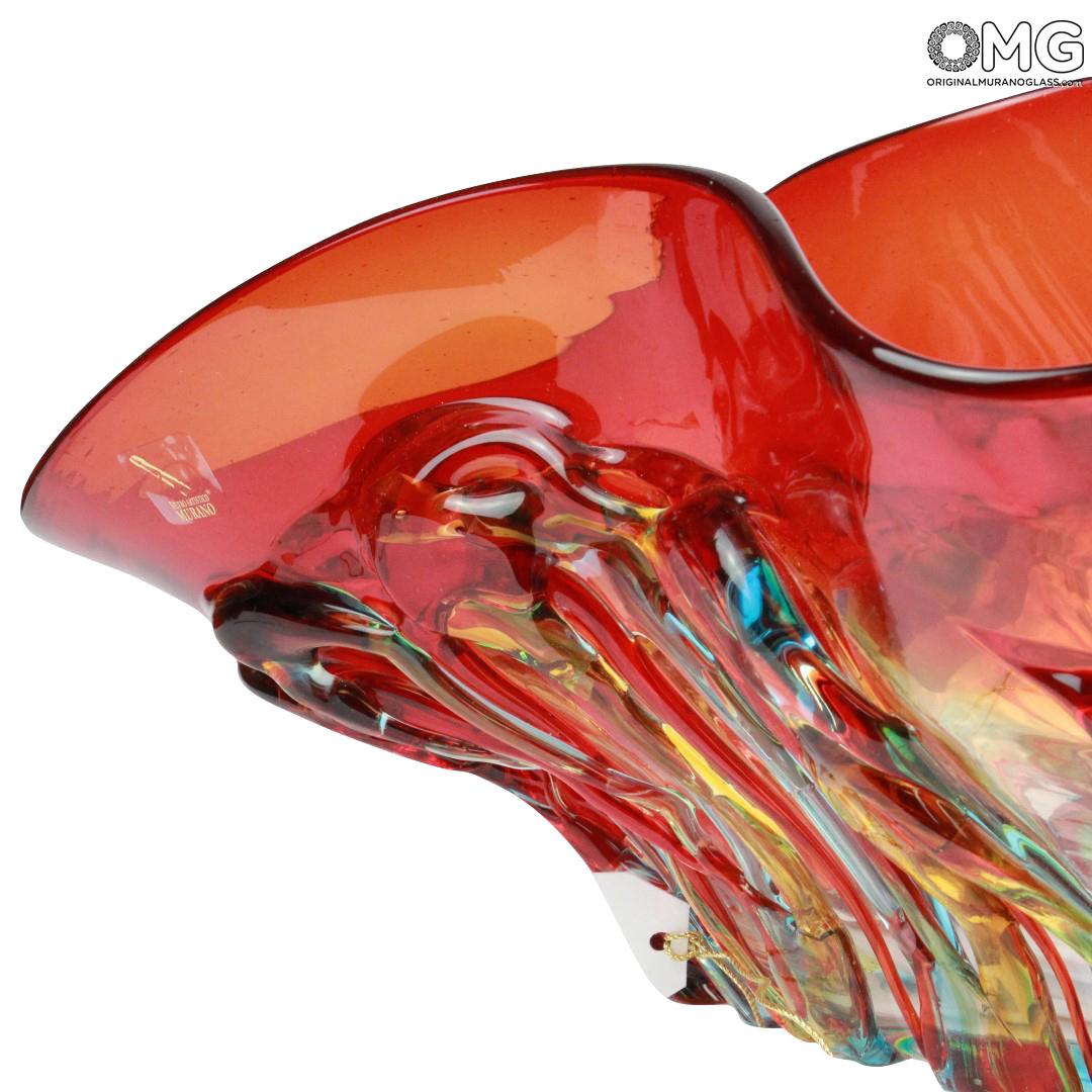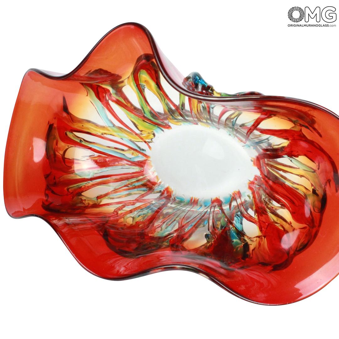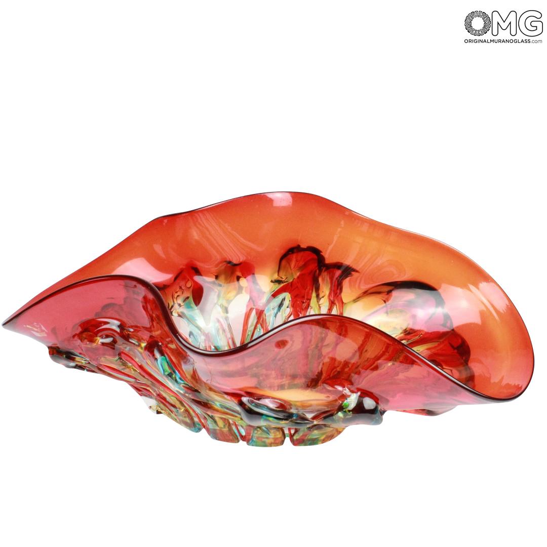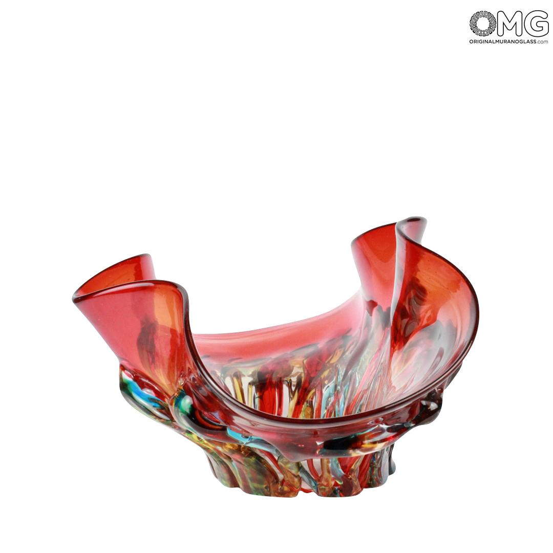 Ciotola in vetro originale di Murano realizzata interamente a mano dai nostri maestri vetrai secondo le più antiche tecniche tradizionali. La ciotola, dalle modeste dimensioni, è relizzata combinando diversi colori. Quello dominante è il rosso rubino Veneziano. Questo colore, uno dei più pregiati, rende questo pezzo molto scenico ed affascinante.
