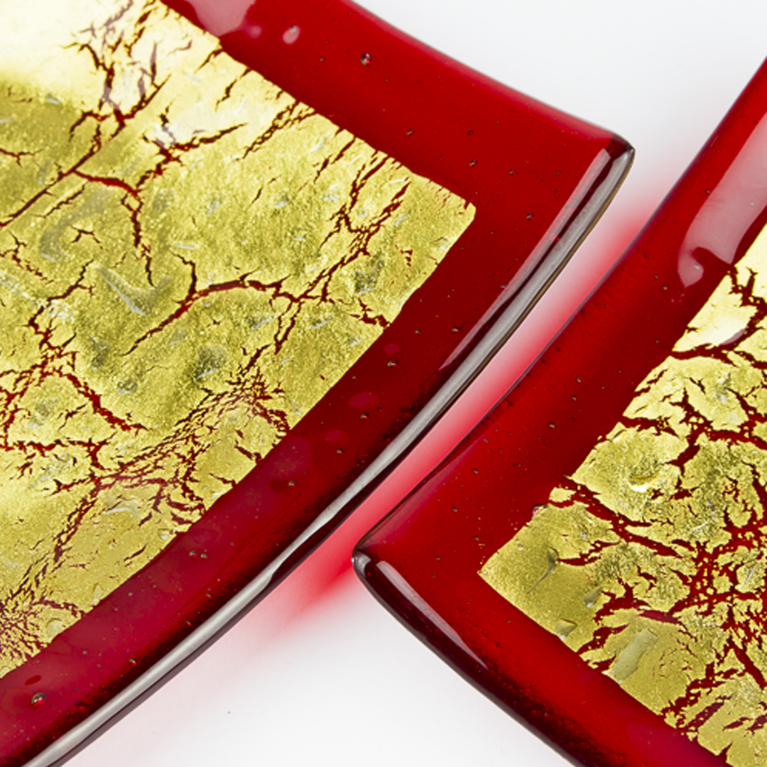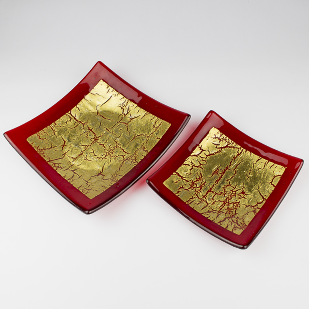 Piatto realizzato con la tecnica della vetrofusione in vetro di Murano ed impreziosito da una vera foglia d'oro 24 carati. Questo piatto è un'ottima idea regalo per tutte le occasioni, specialmente come bomboniera o per arredare un tavolo o una mensola.