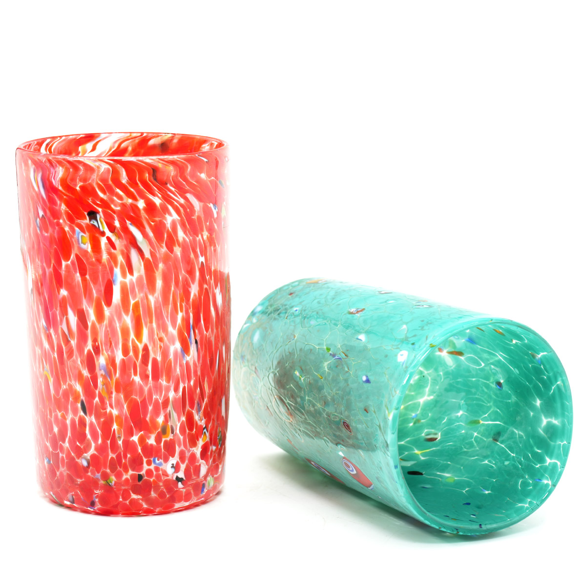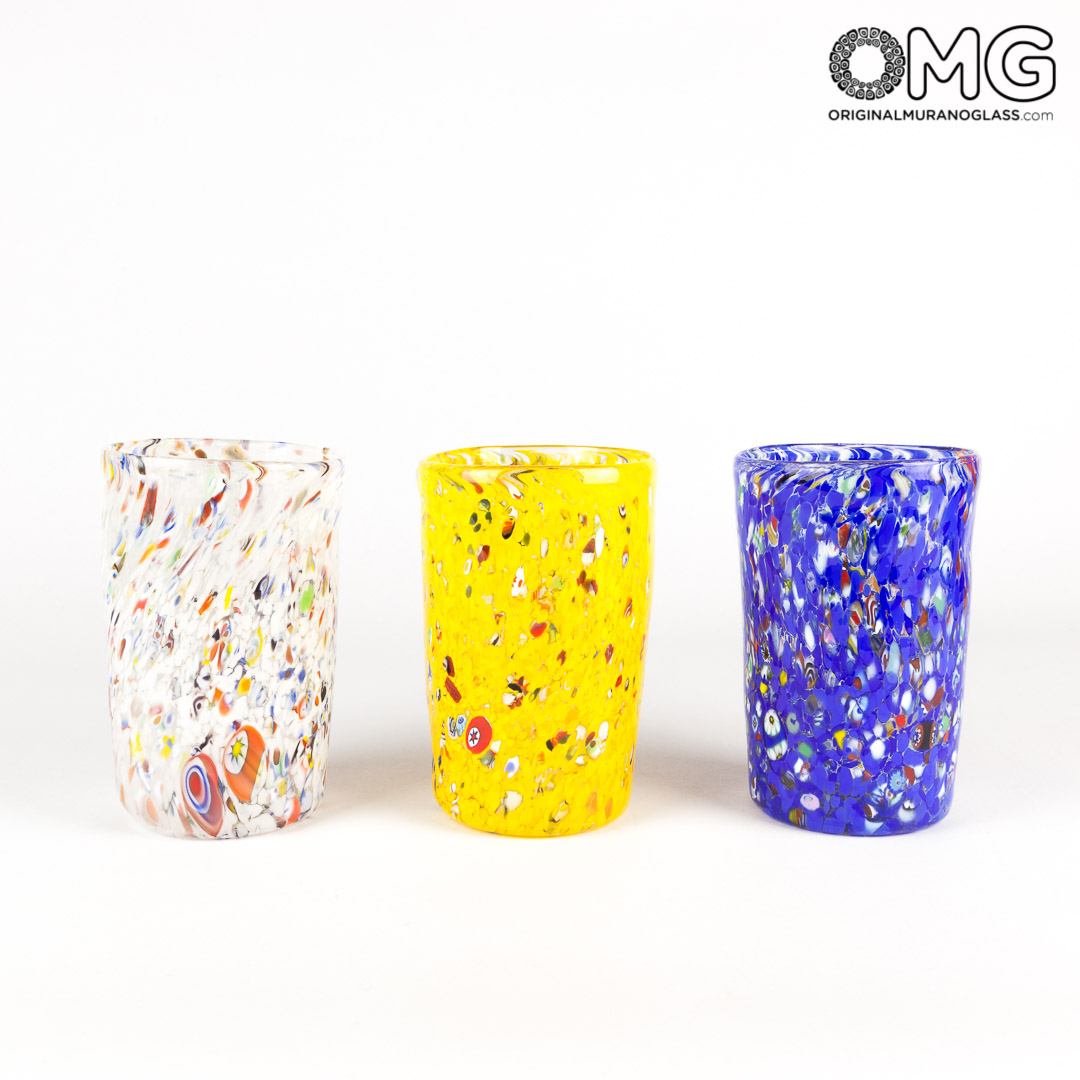 Il set si intende composto da 6 bicchieri in vetro di Murano originali con forma circolare, sono soffiati a caldo dai nostri maestri.