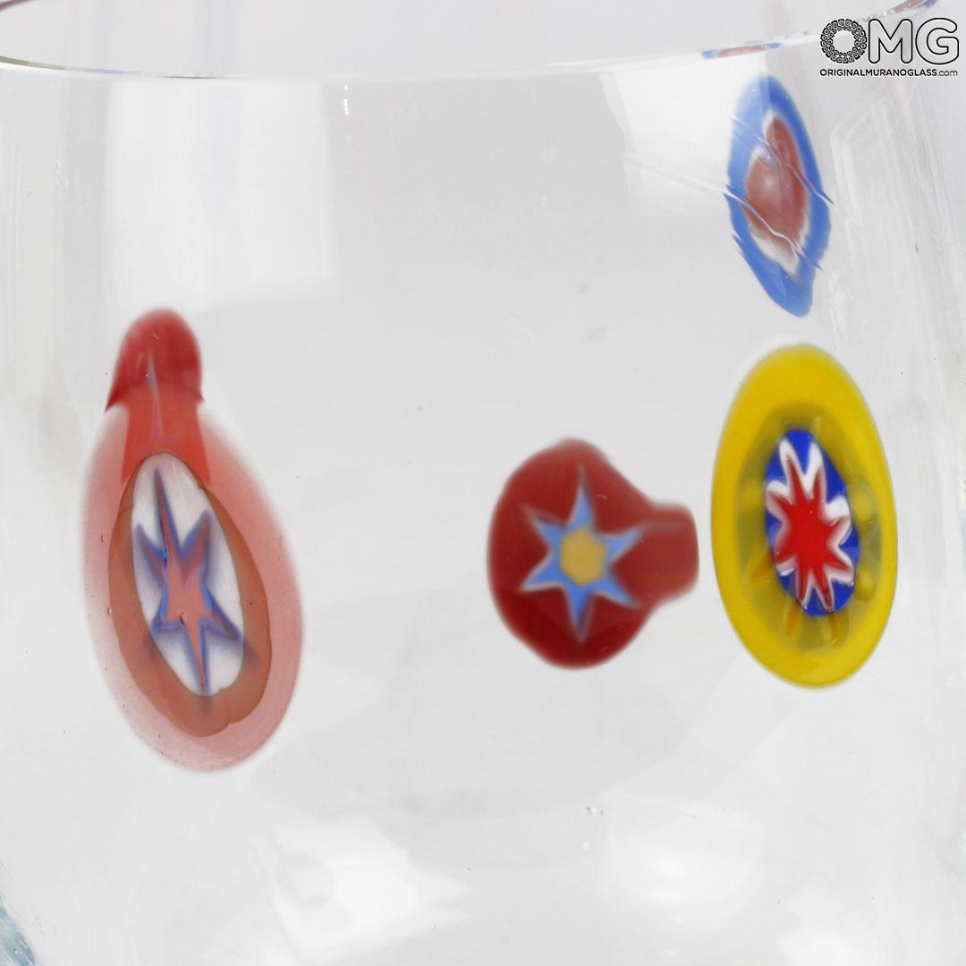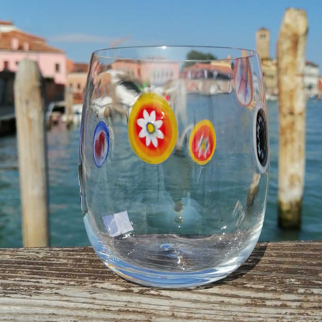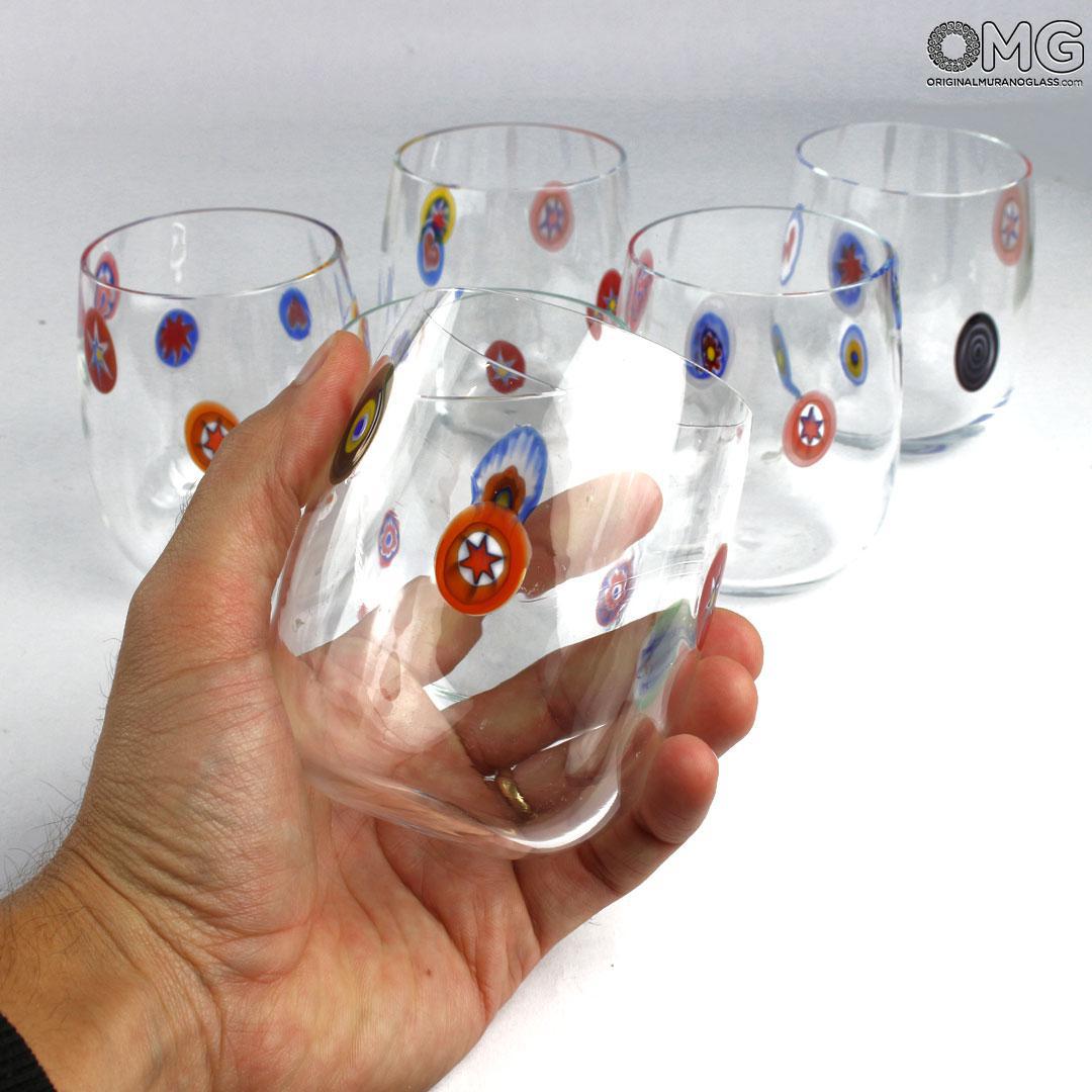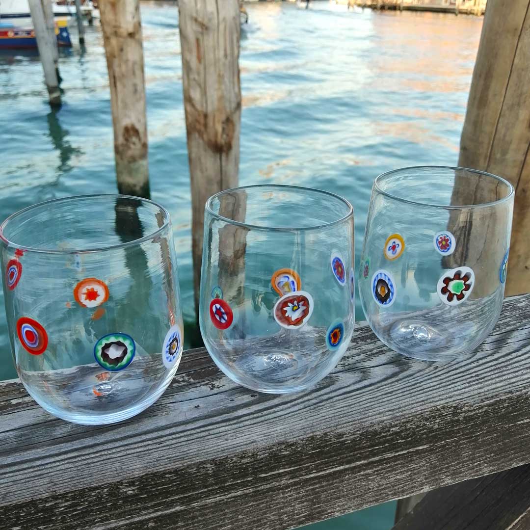 Set di 6 bicchieri artistici realizzati con la tecnica del vetro soffiato e impreziositi da murrine multicolore.