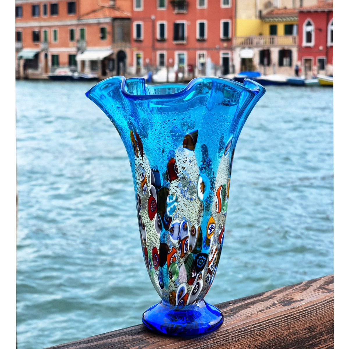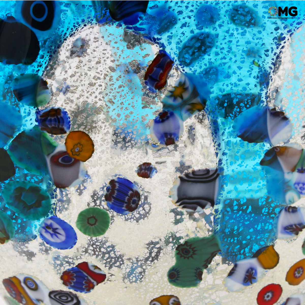 Il vaso è realizzato con la tecnica del vetro soffiato con le murrine millefiori miste colore e argento. L'opera firmata dal maestro e con il marchio Vetro Artistico® Murano applicato.